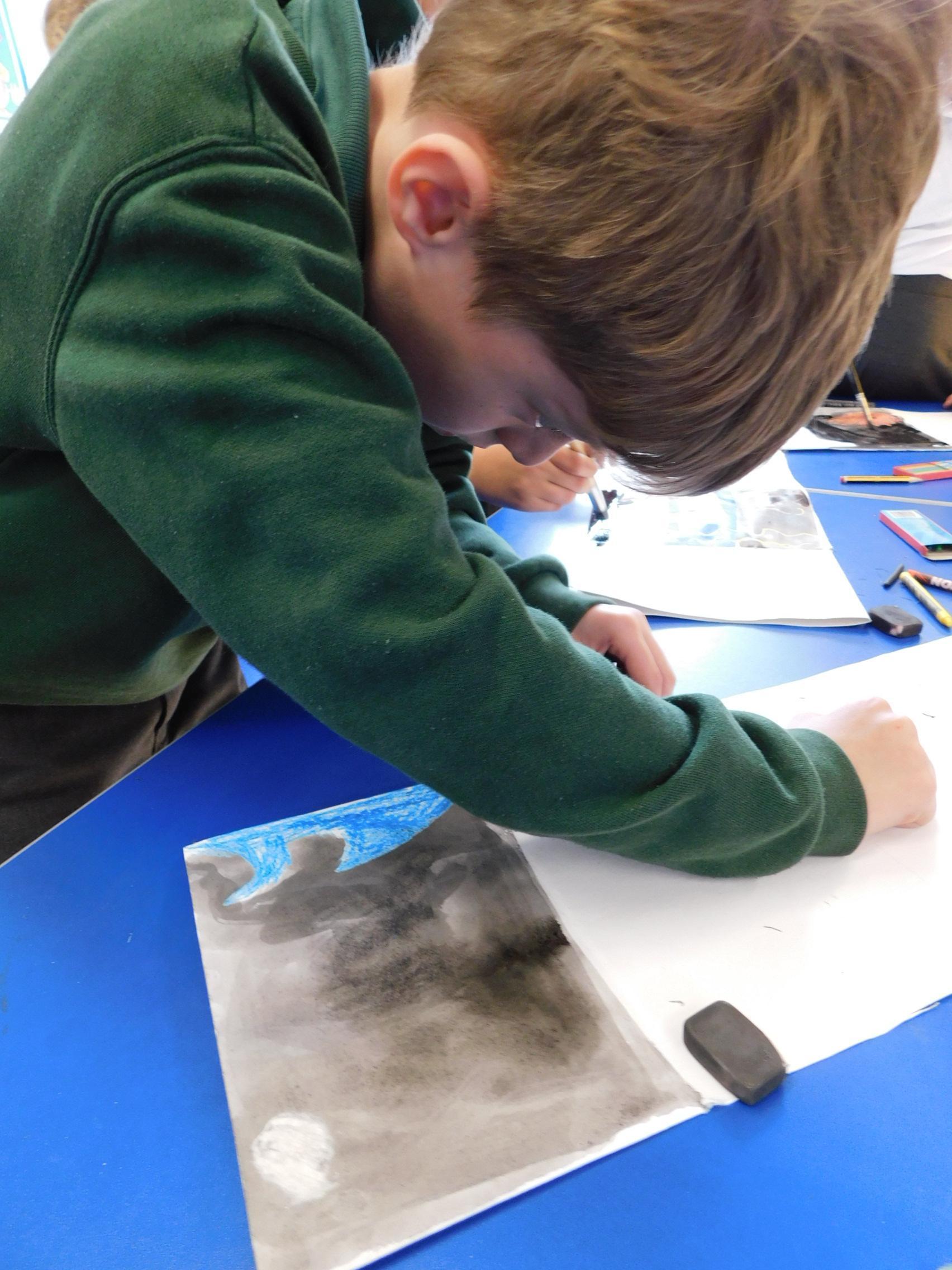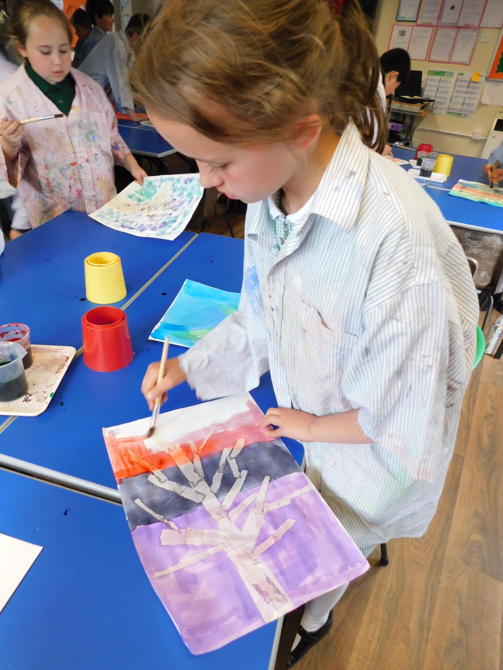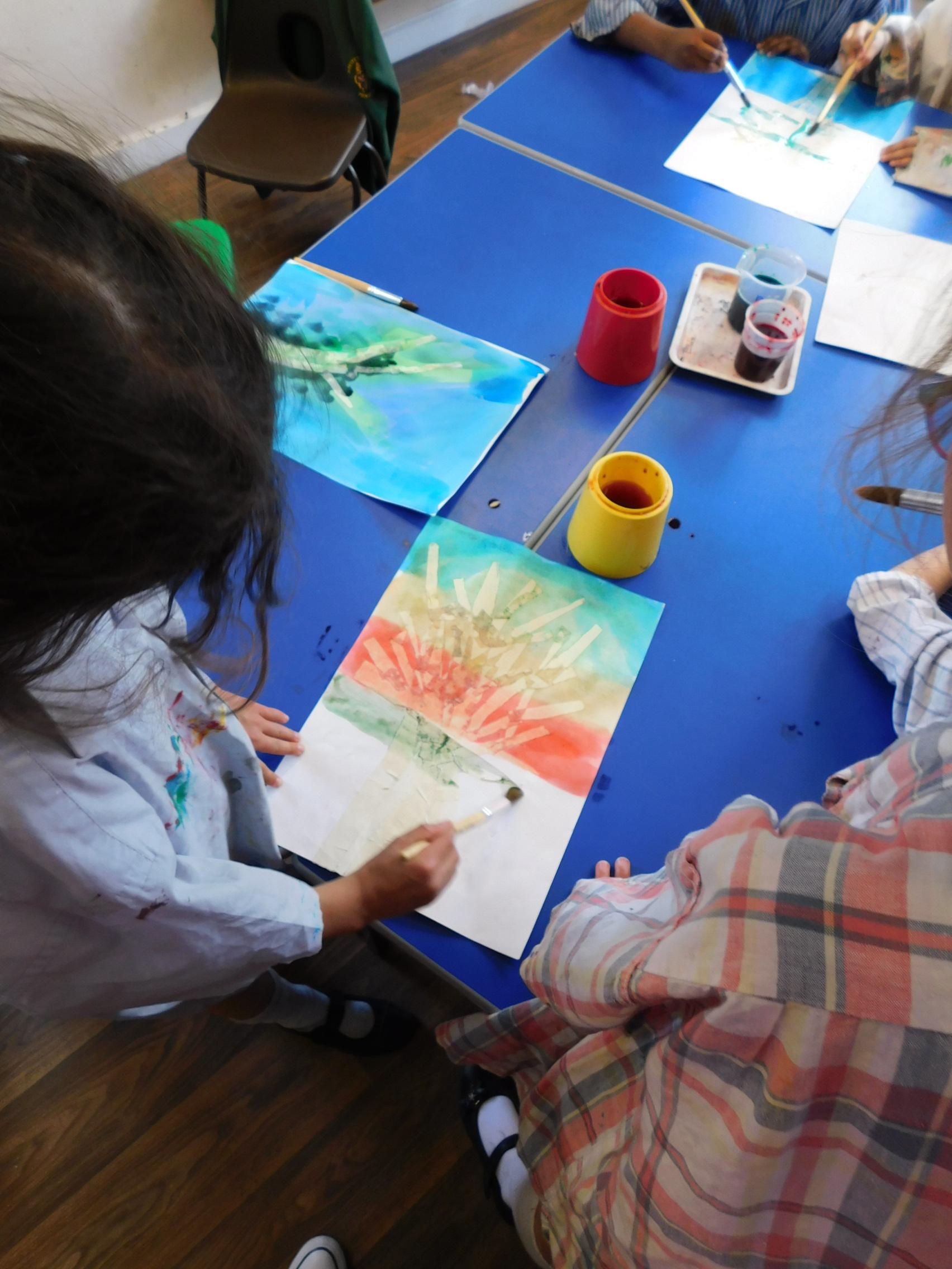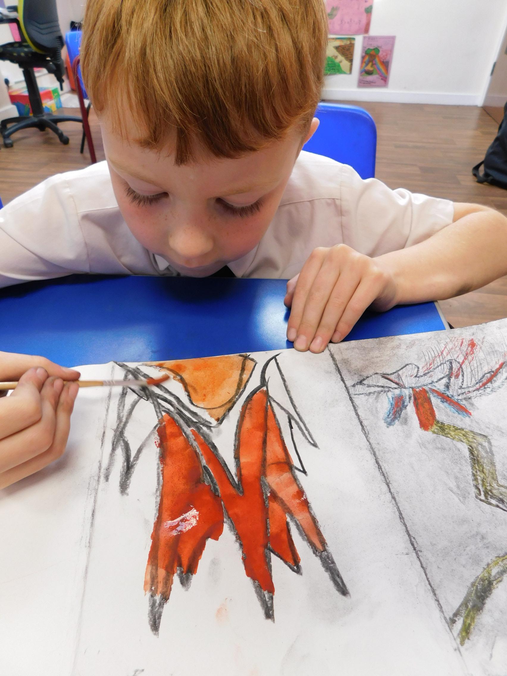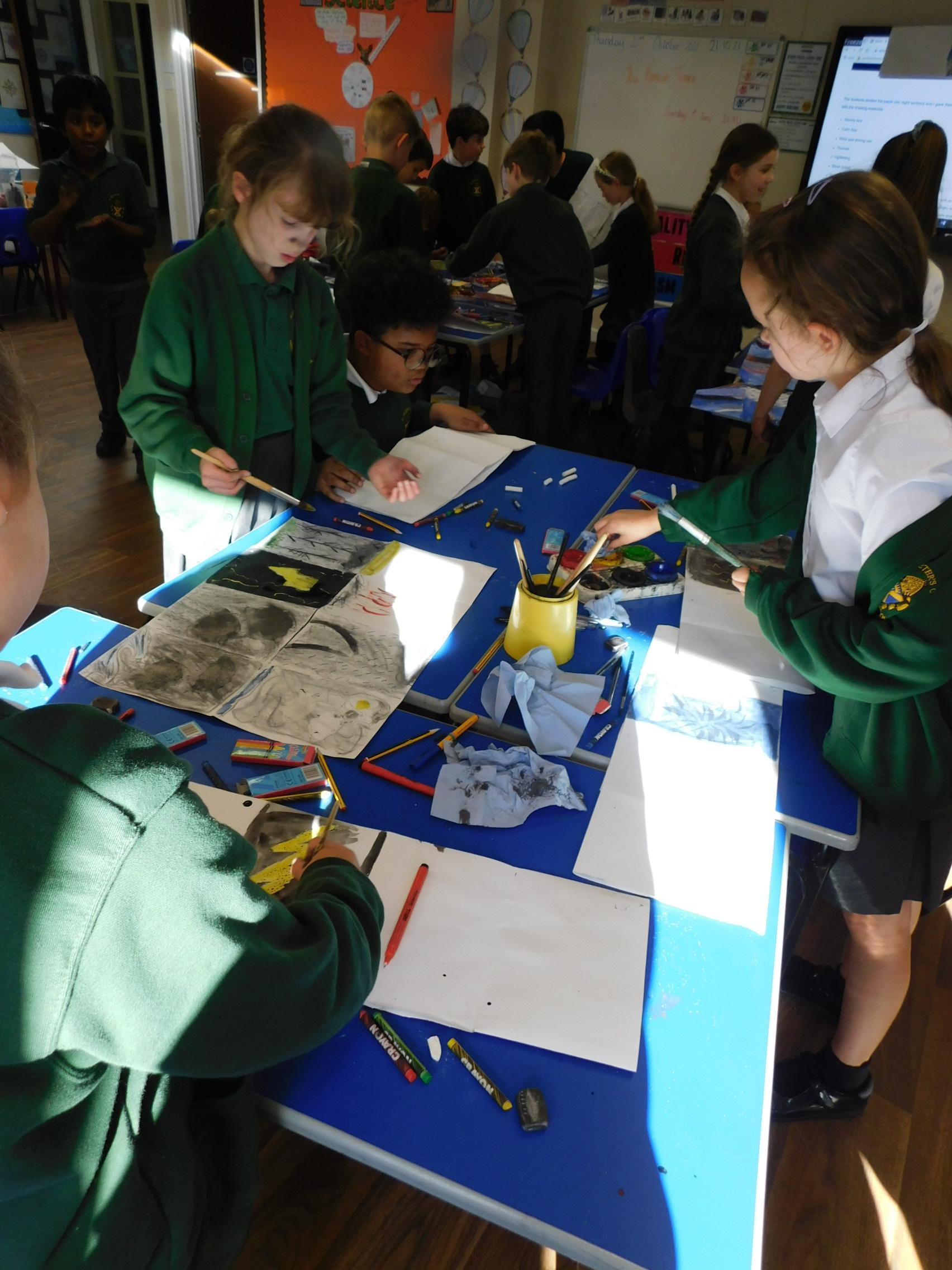 Observational drawing and colourful mark-making from primary and secondary sources, based on our playground trees and British birds.
