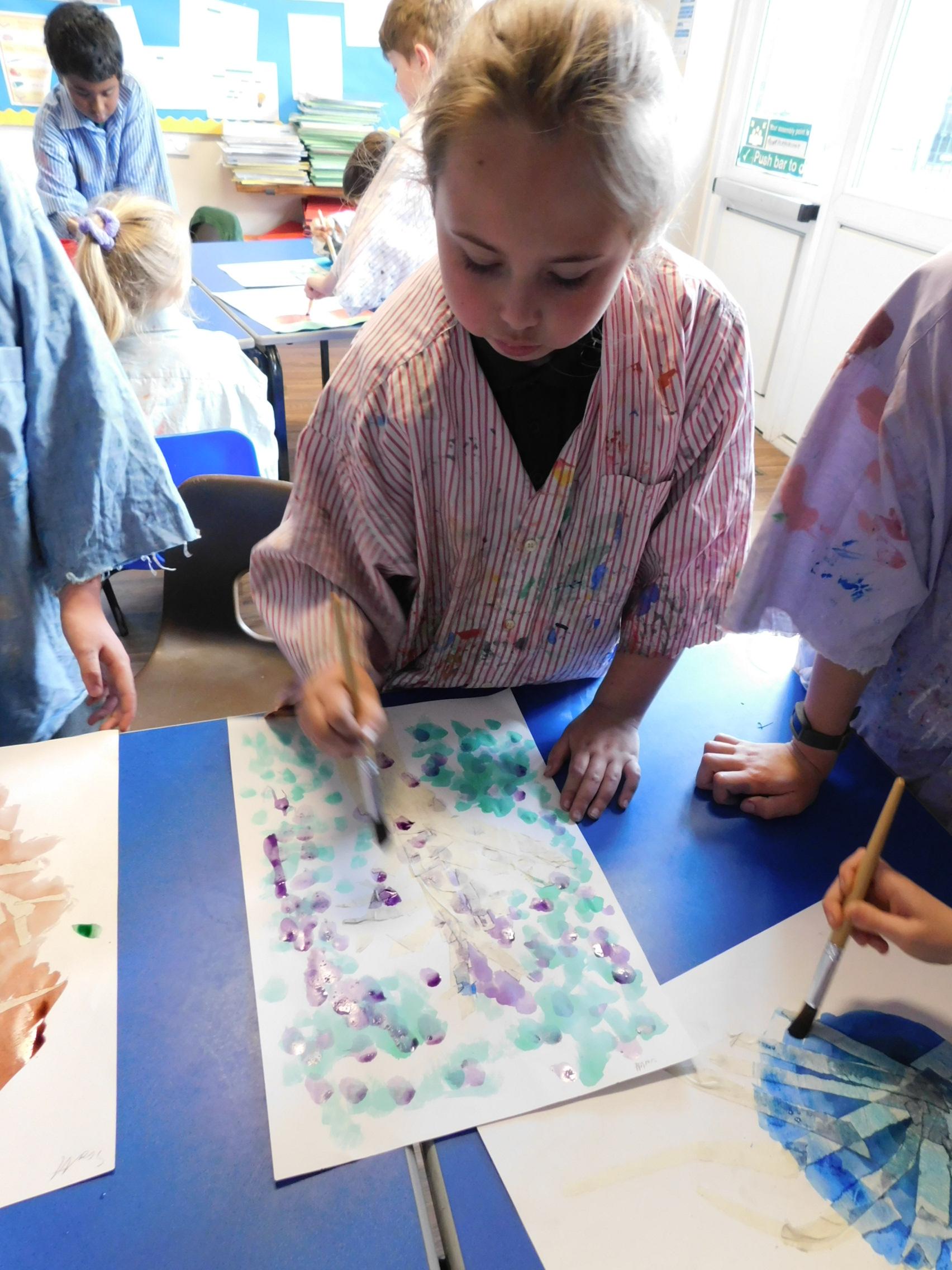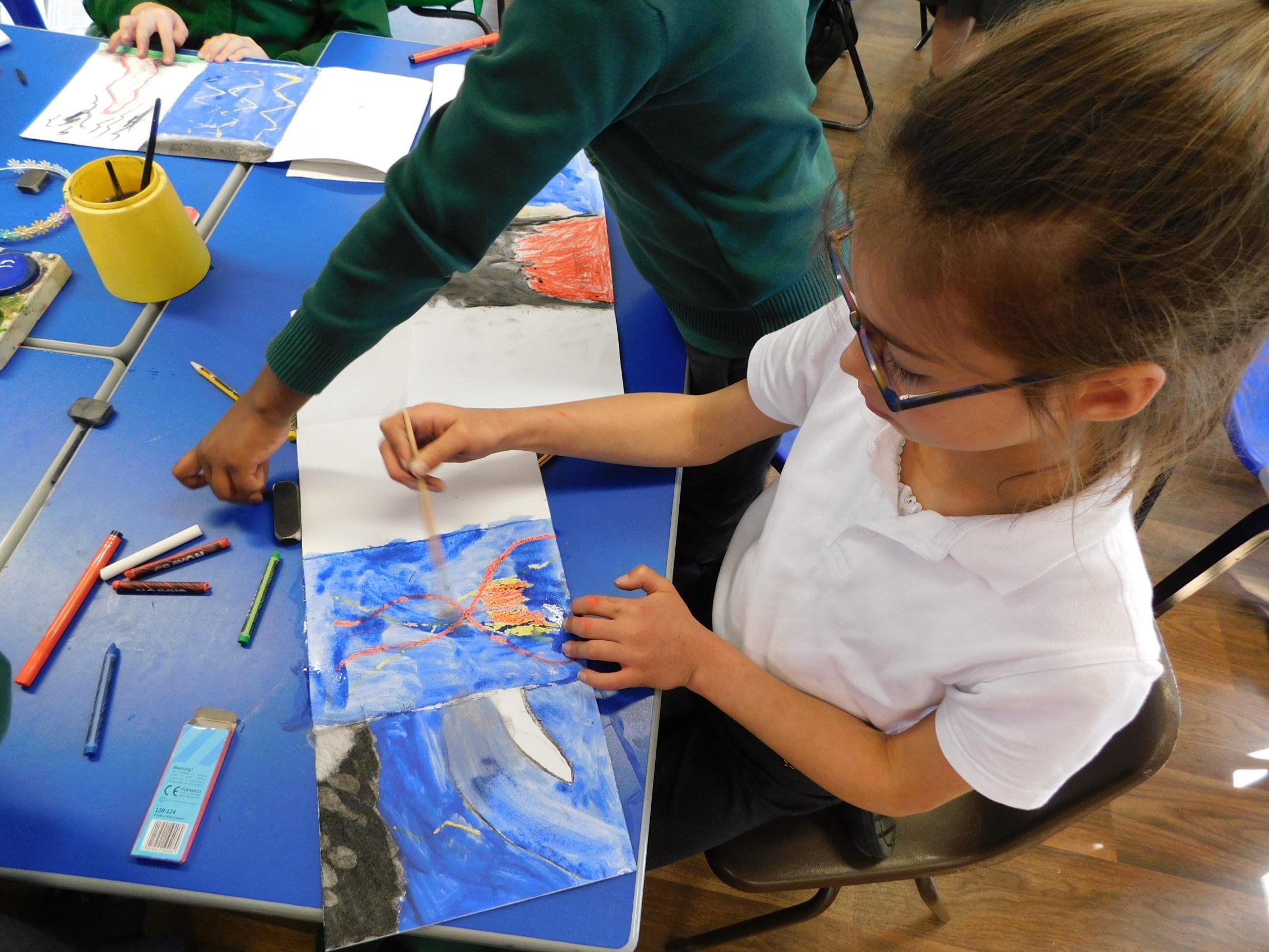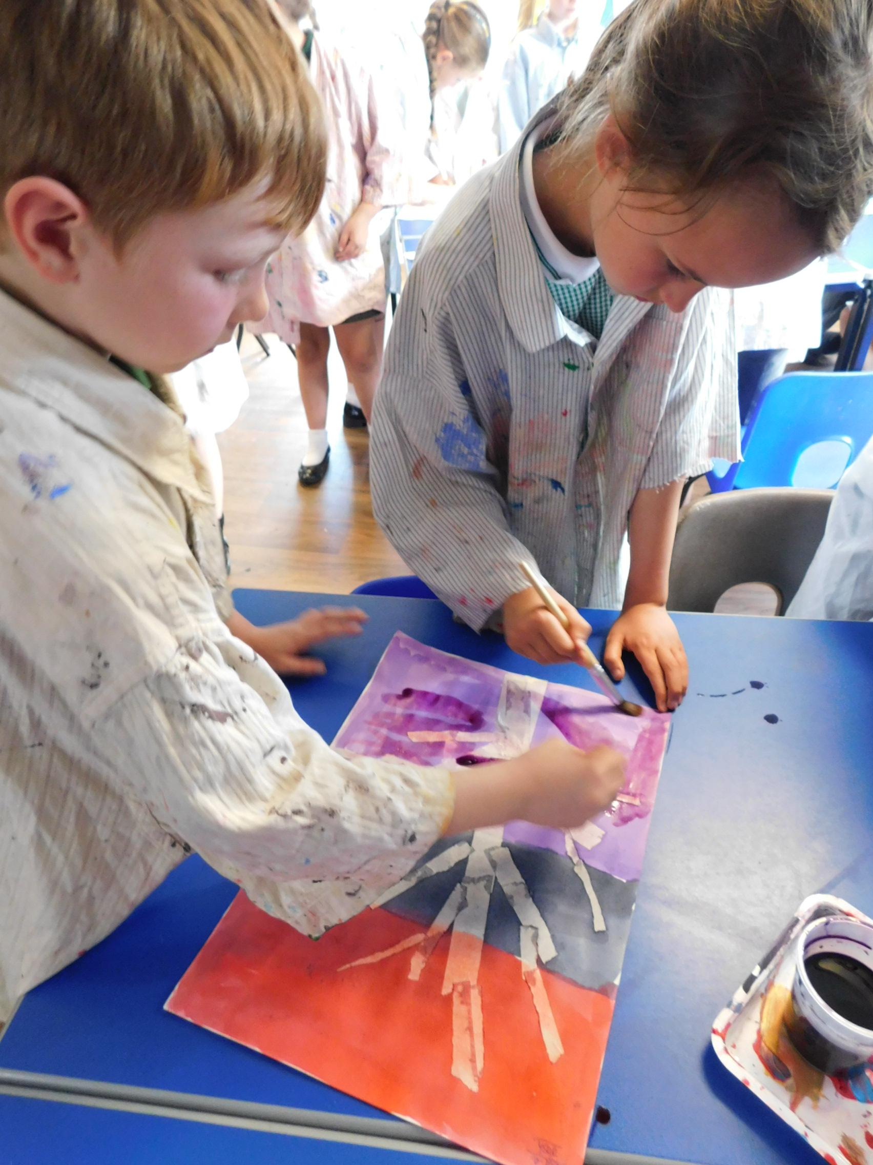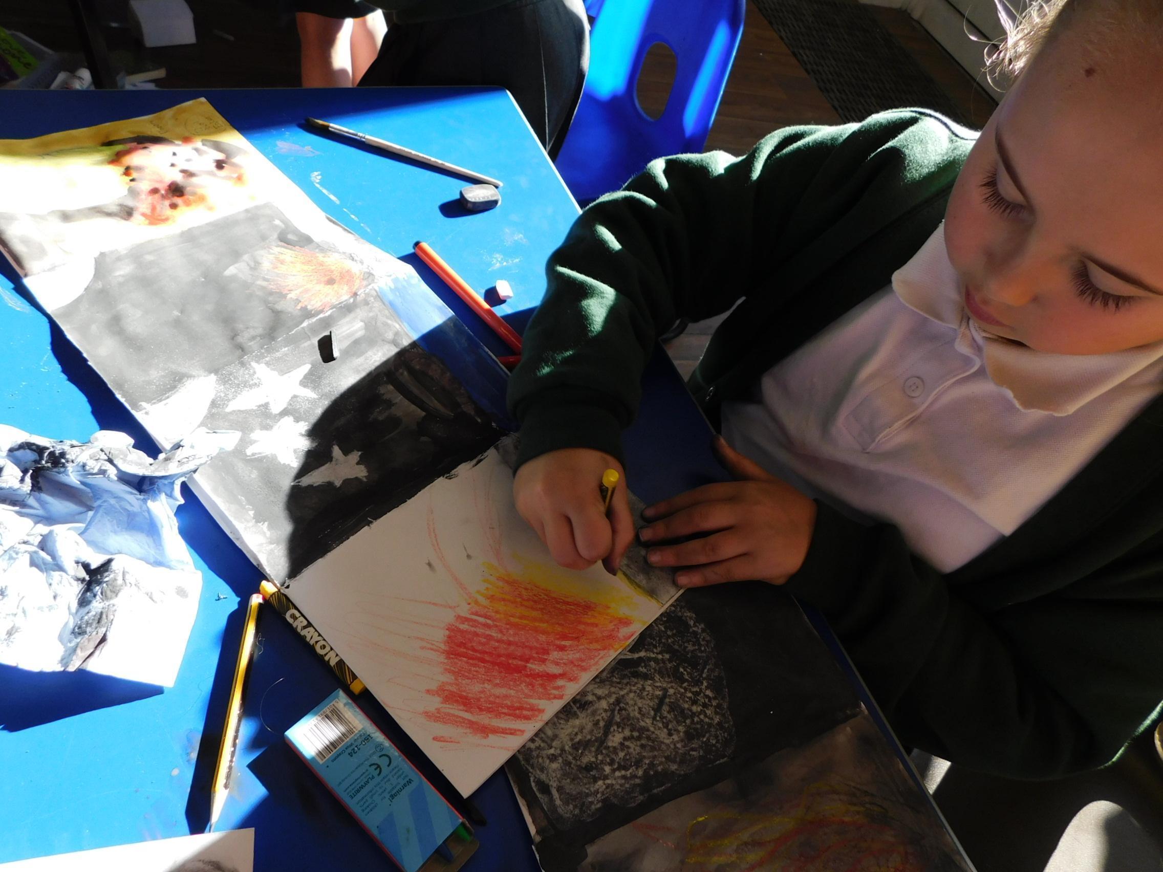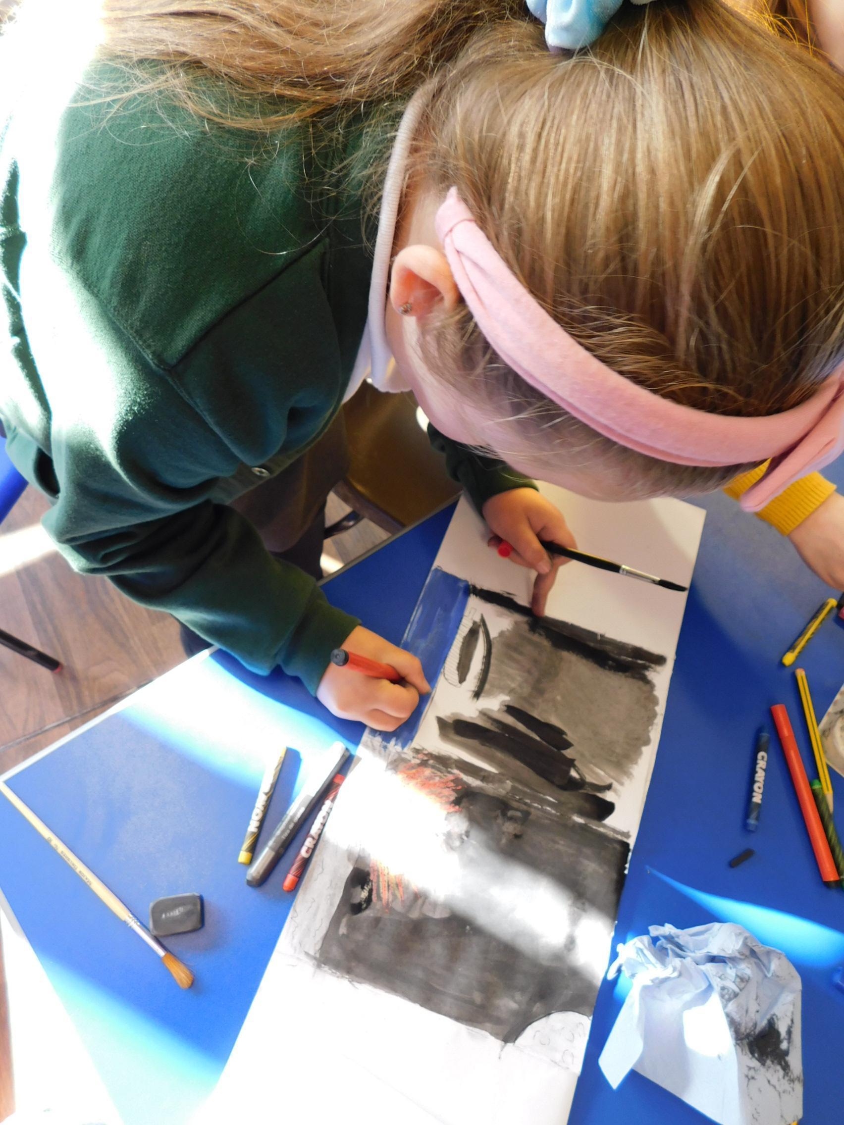 Observational drawing and colourful mark-making from primary and secondary sources, based on our playground trees and British birds.