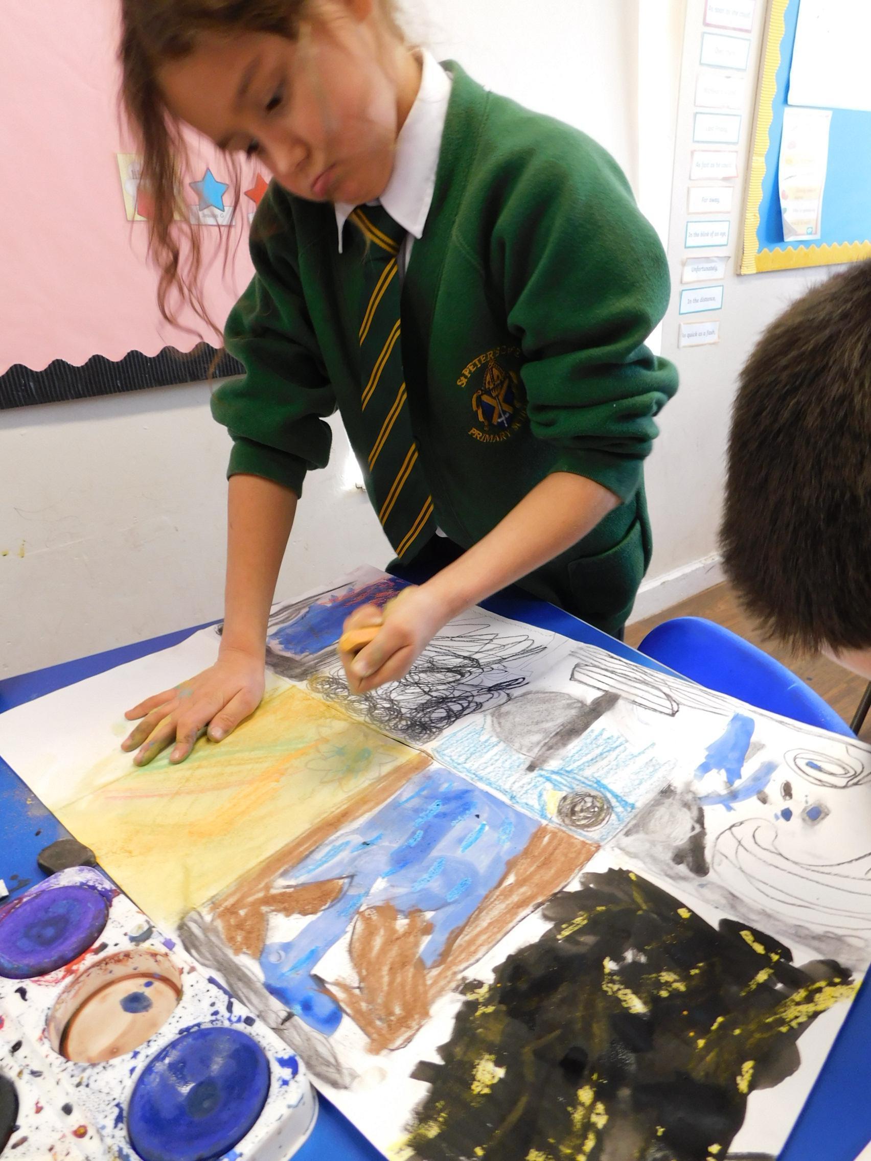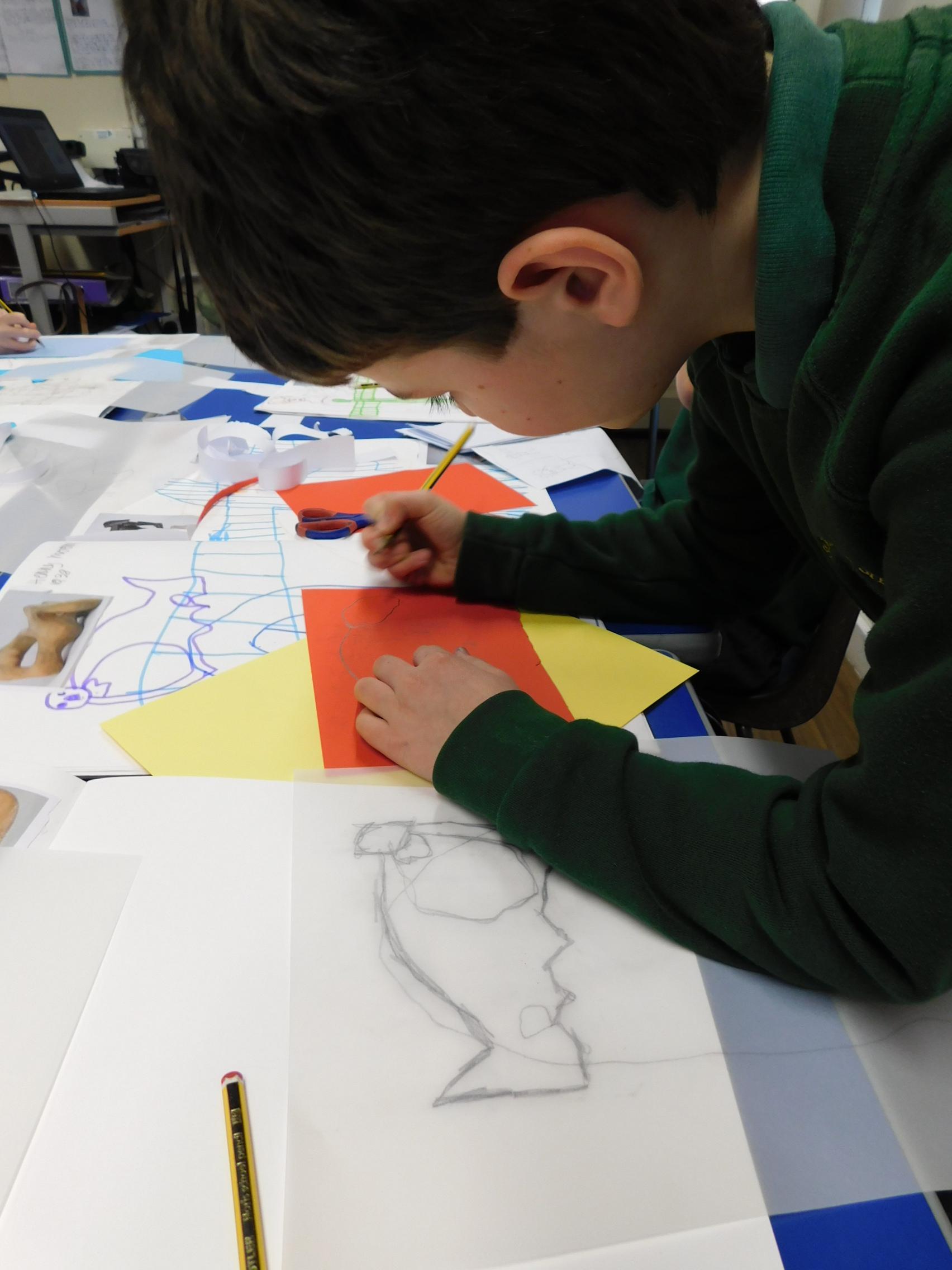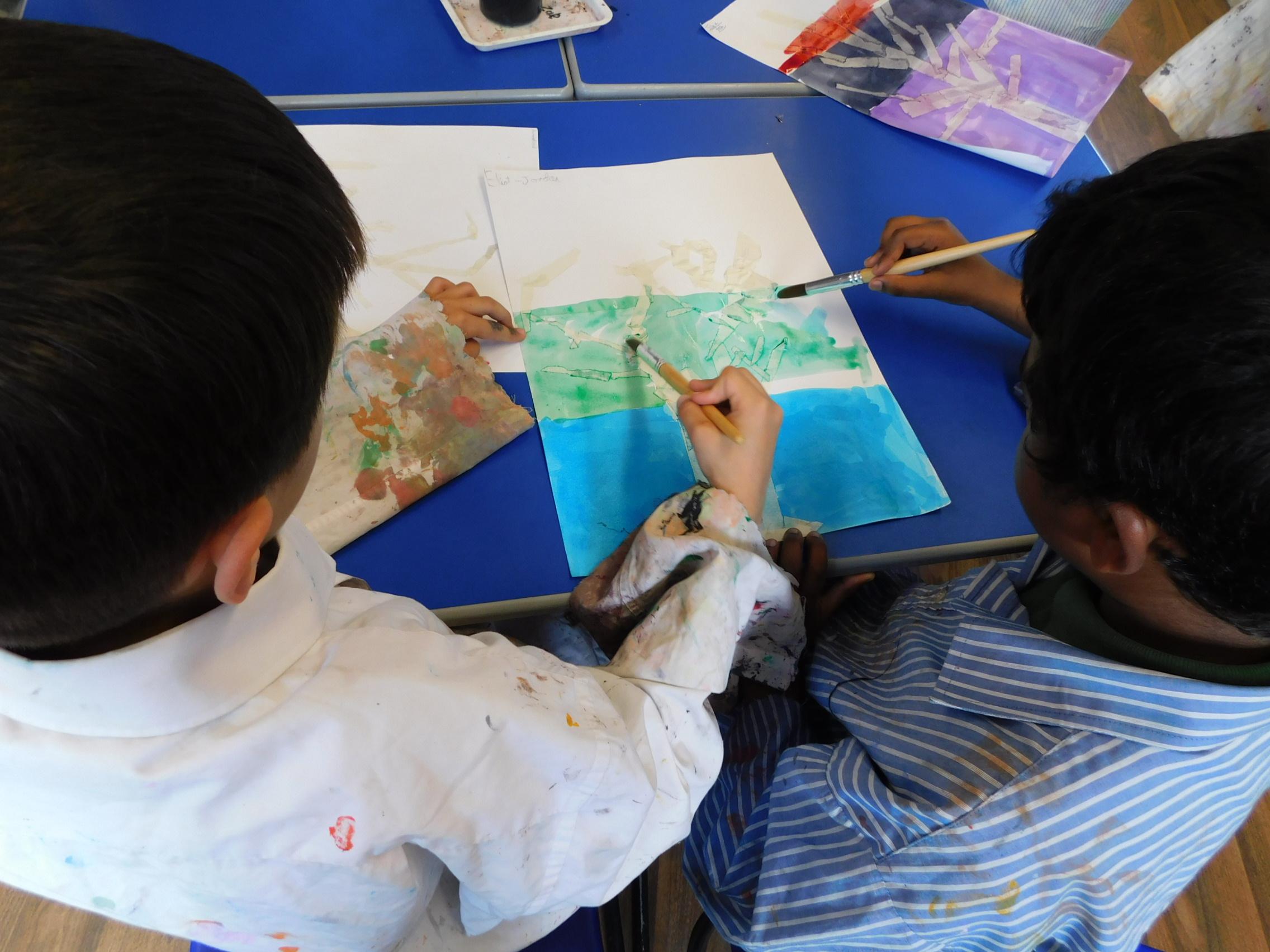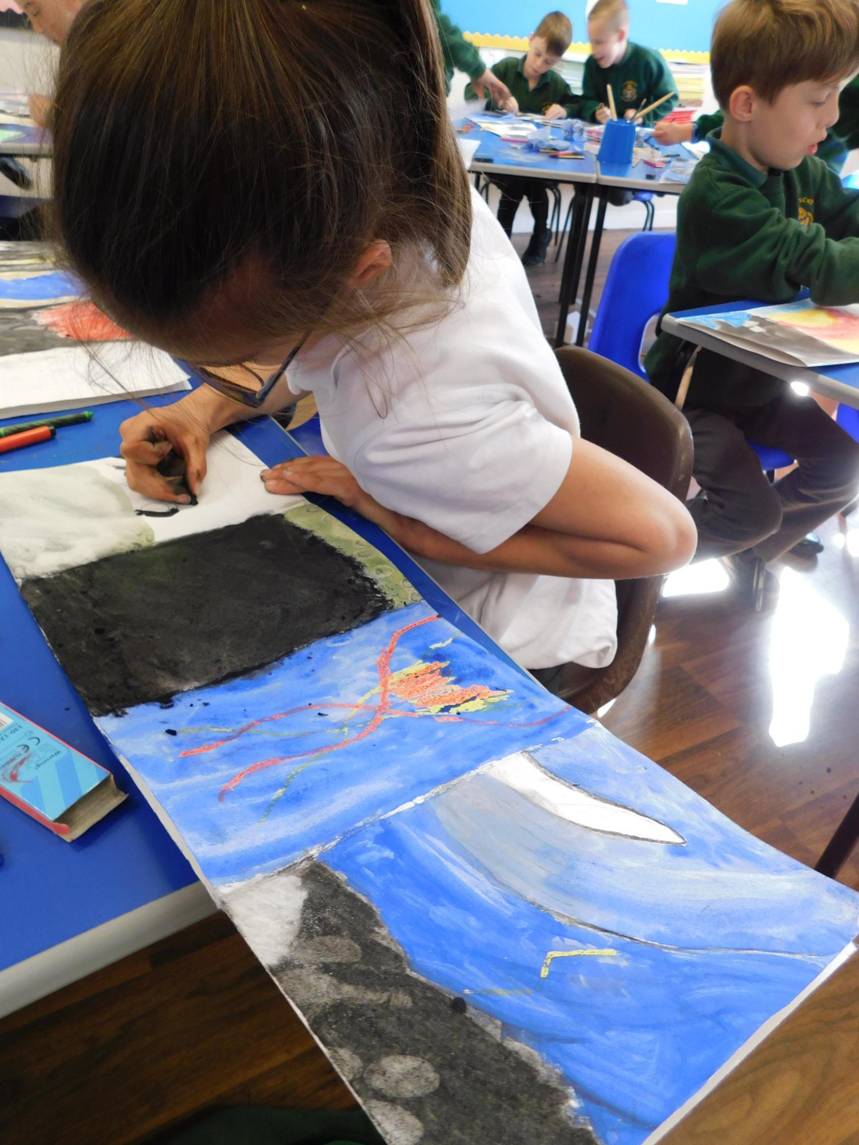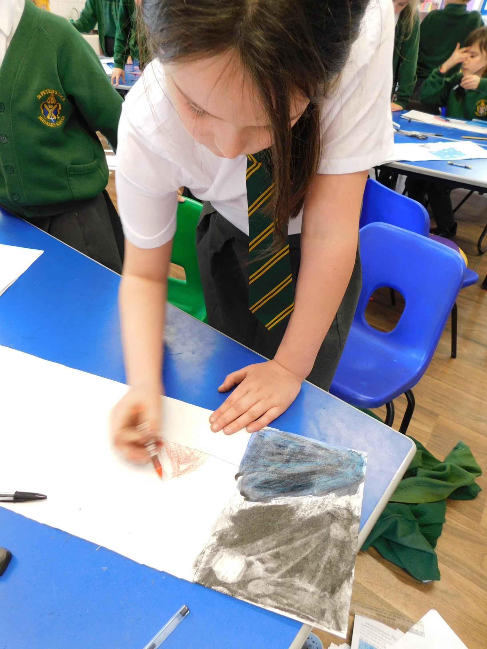 Observational drawing and colourful mark-making from primary and secondary sources, based on our playground trees and British birds.