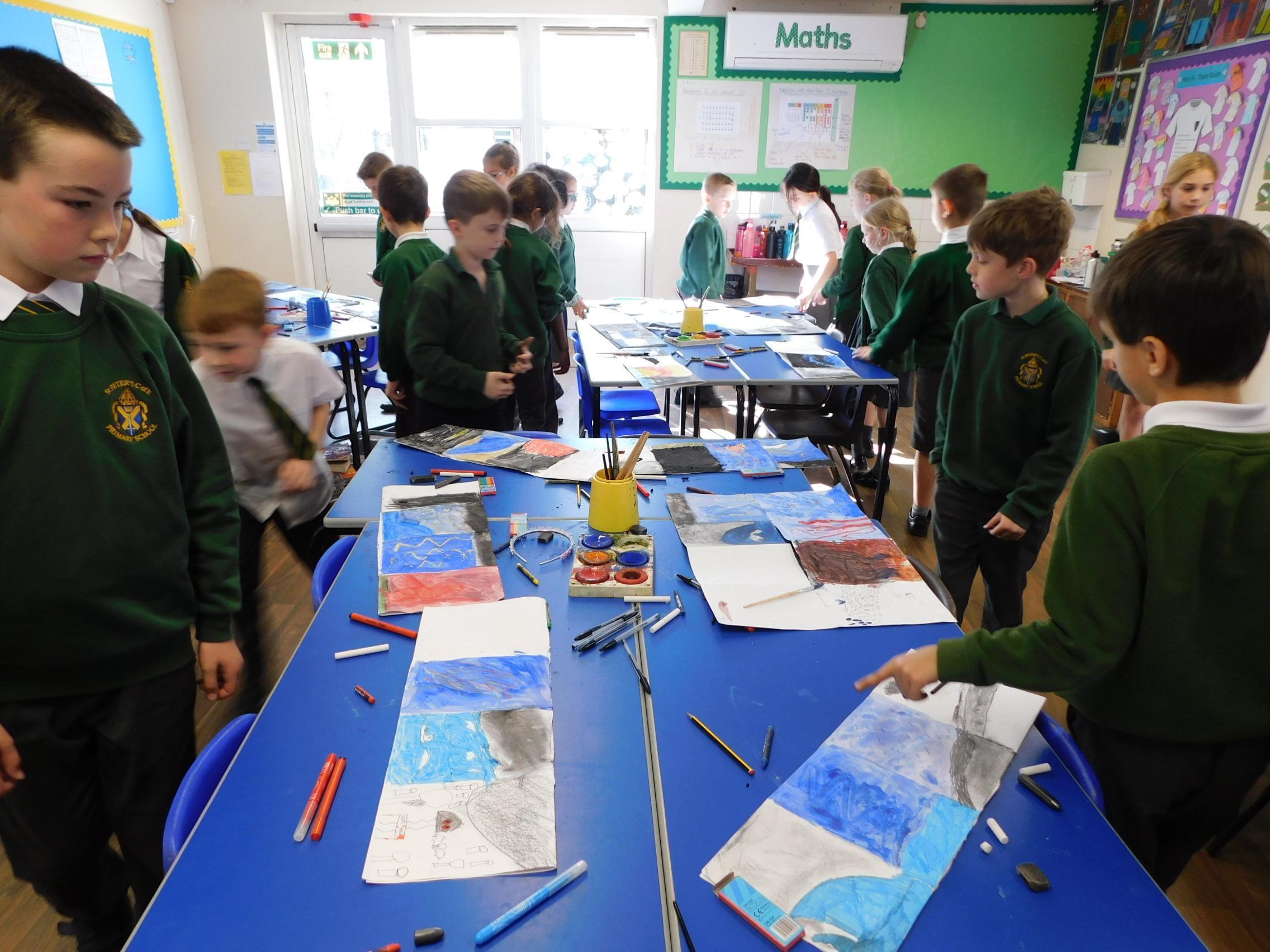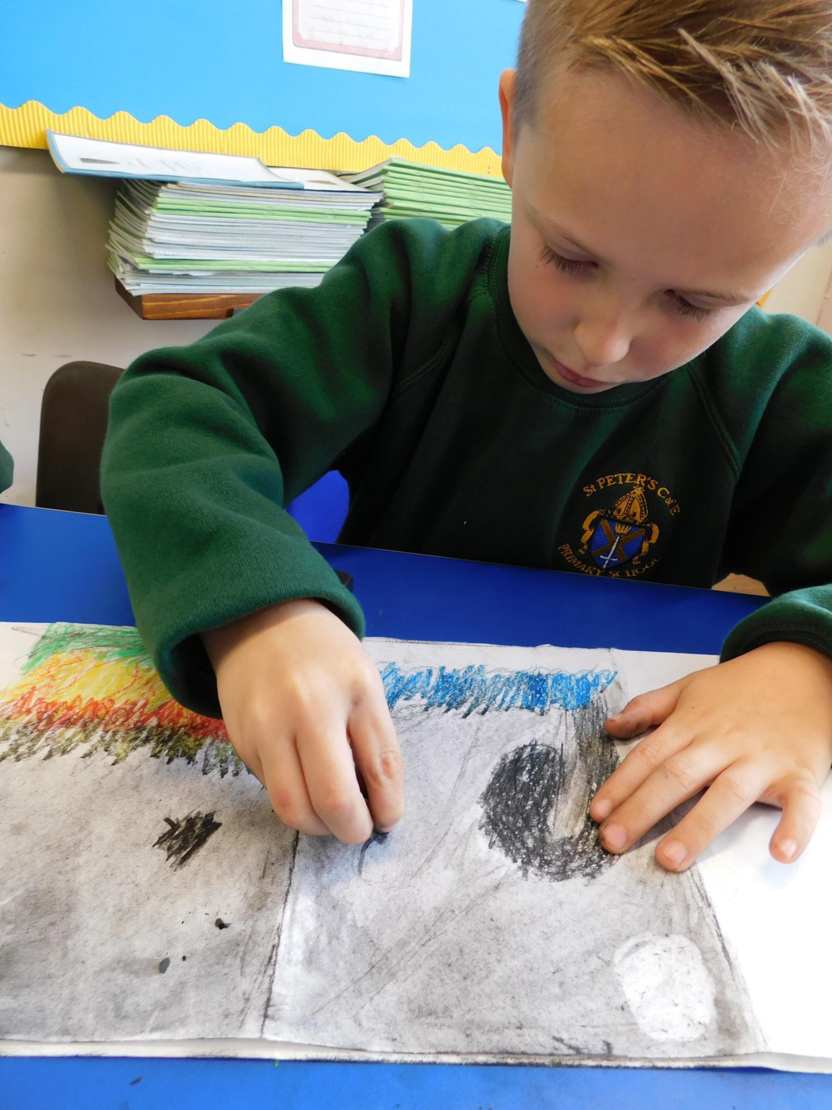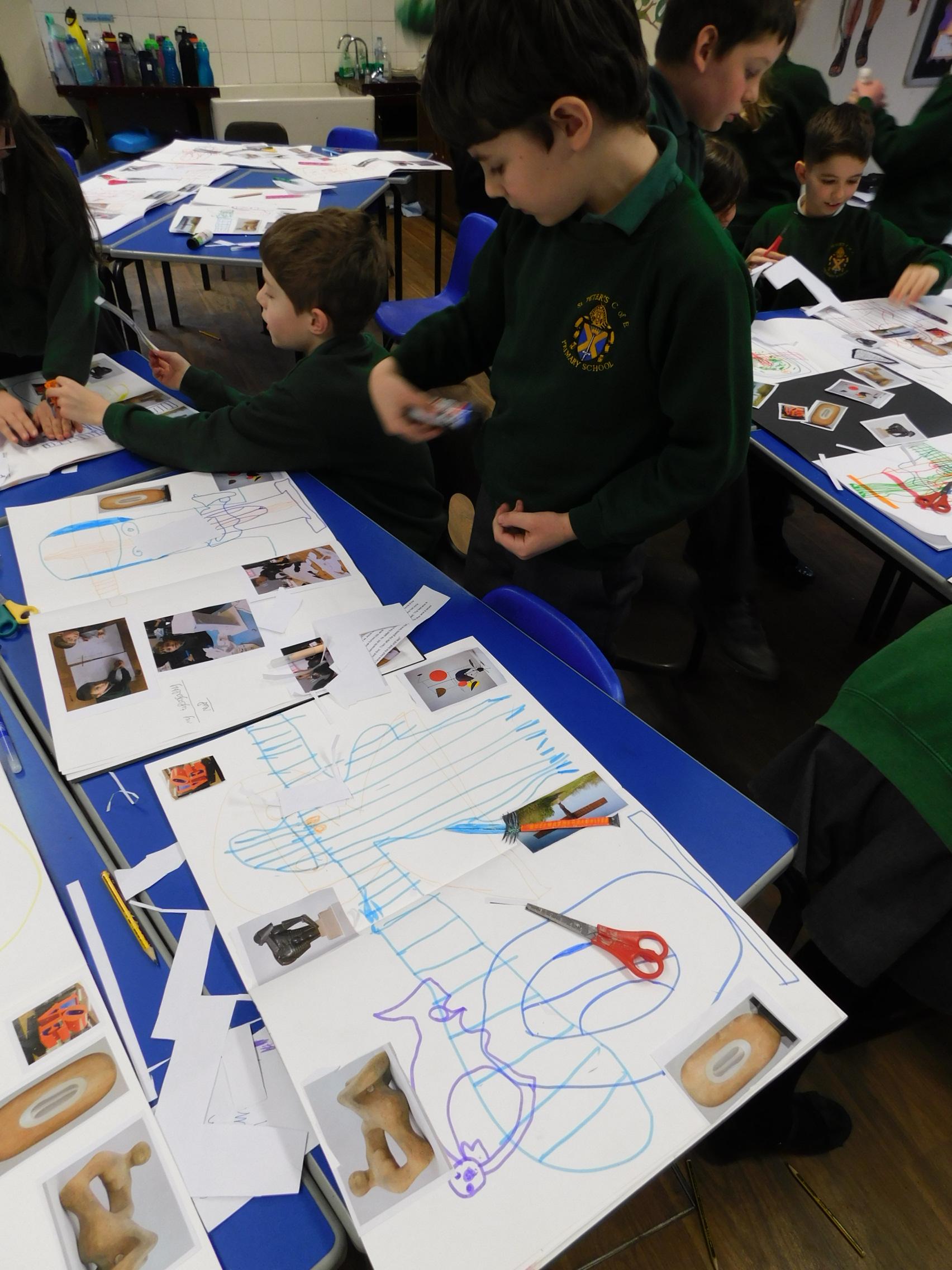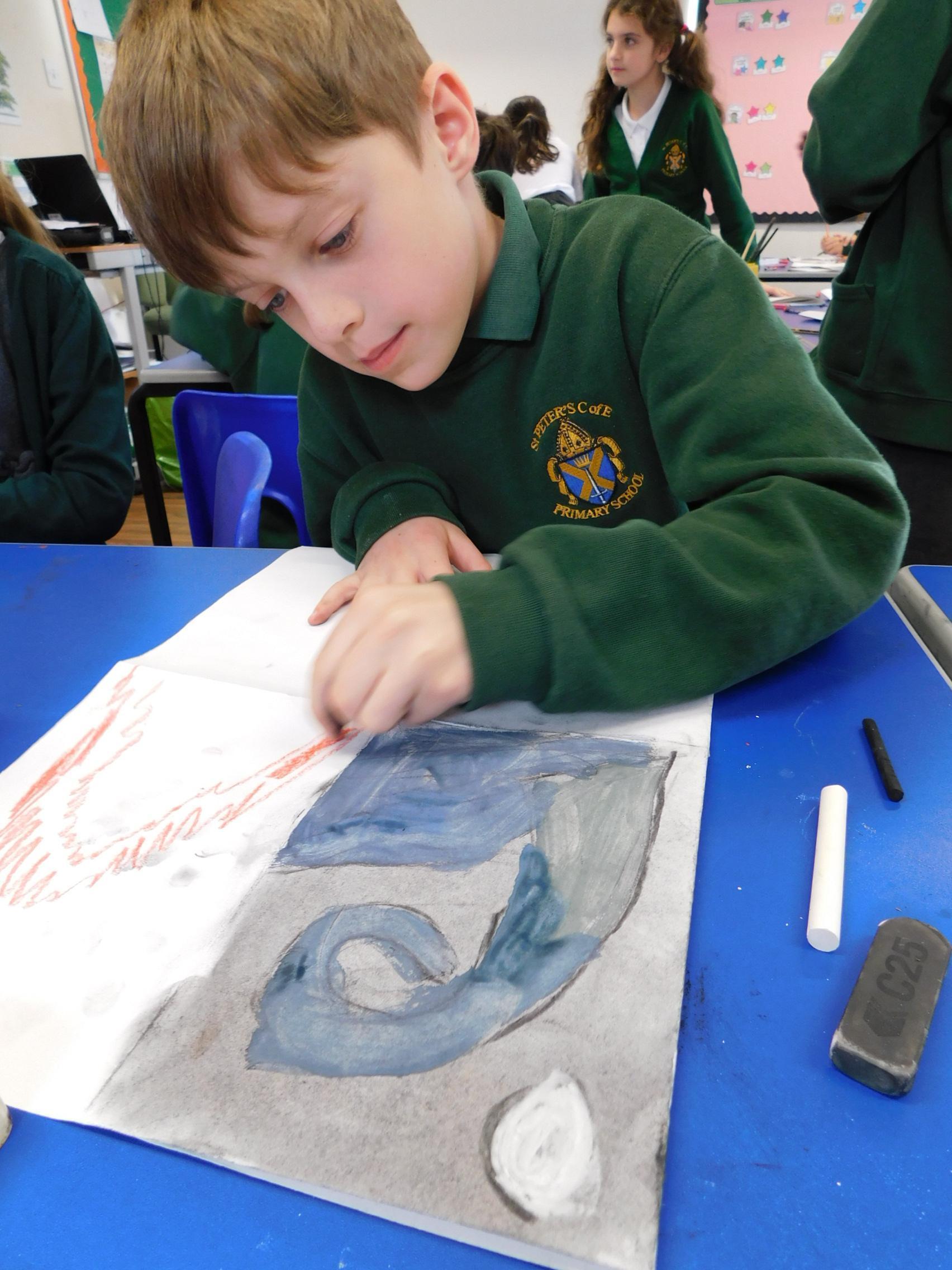 Observational drawing and colourful mark-making from primary and secondary sources, based on our playground trees and British birds.