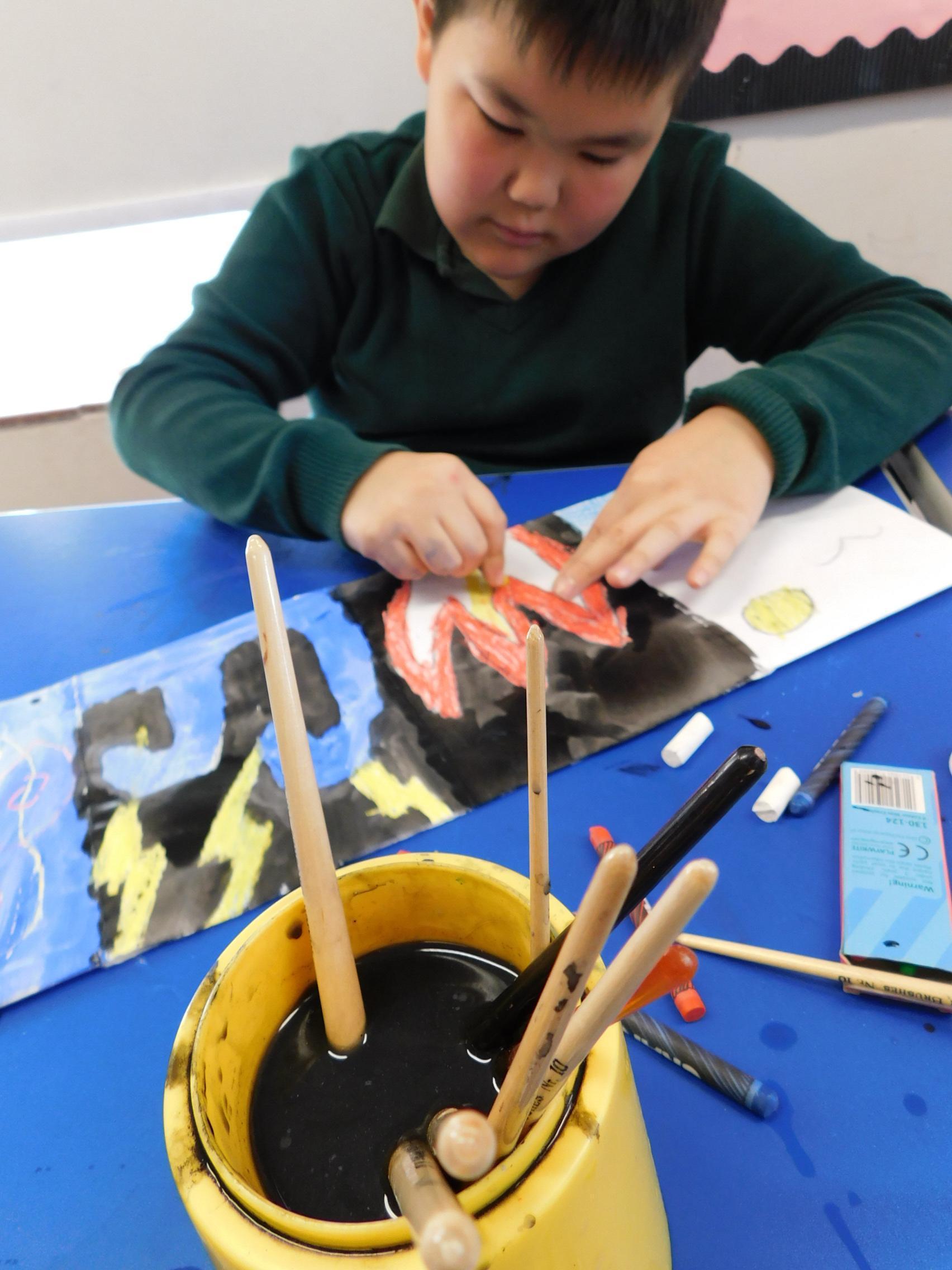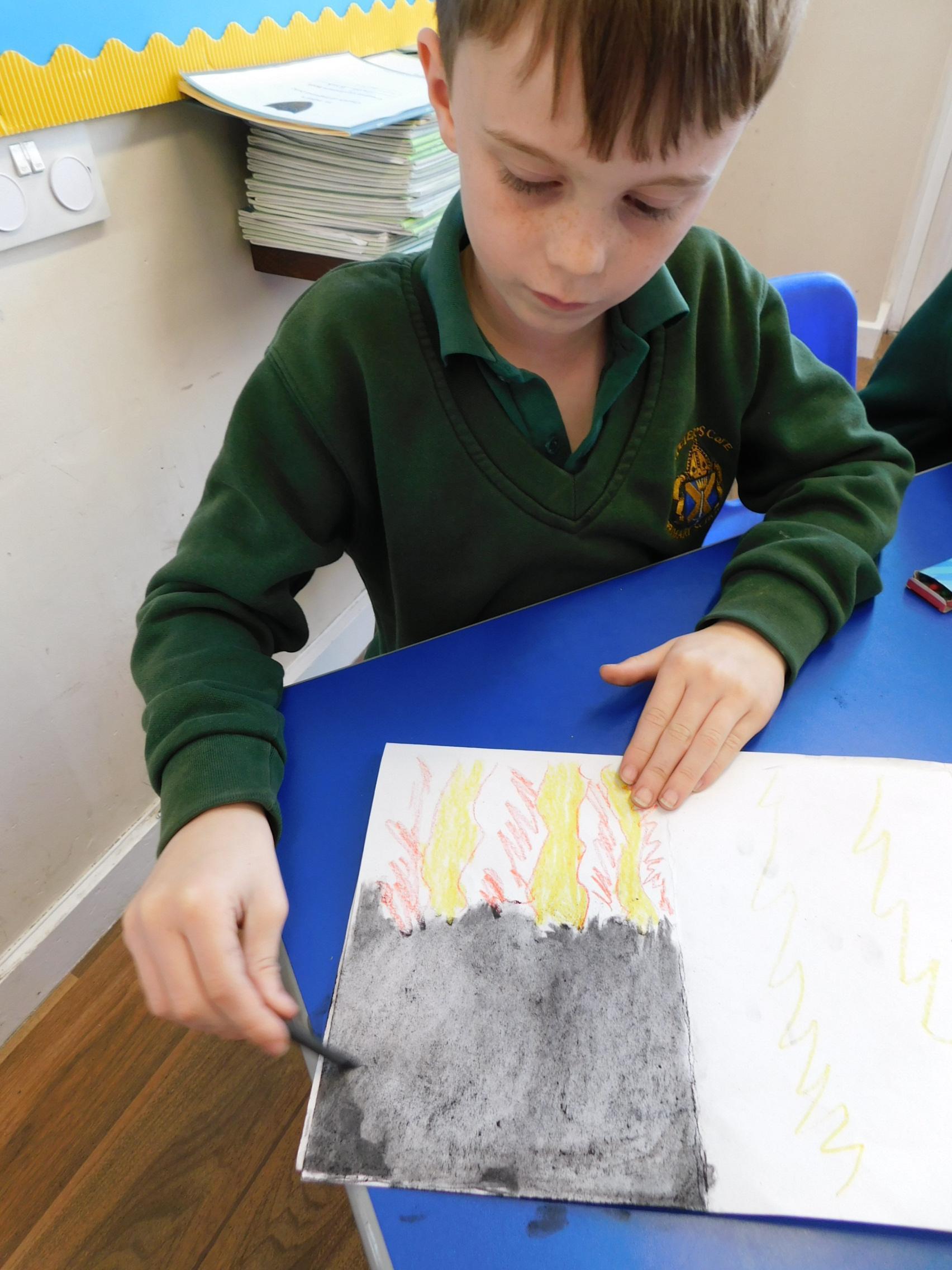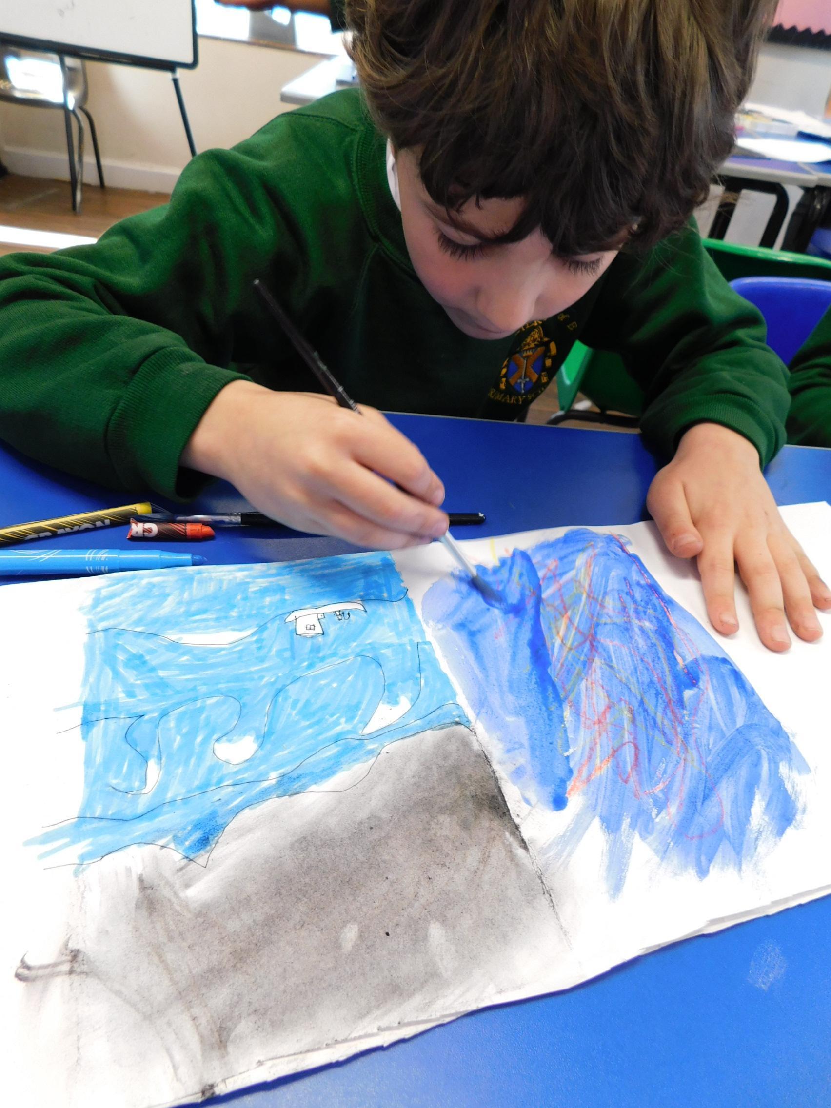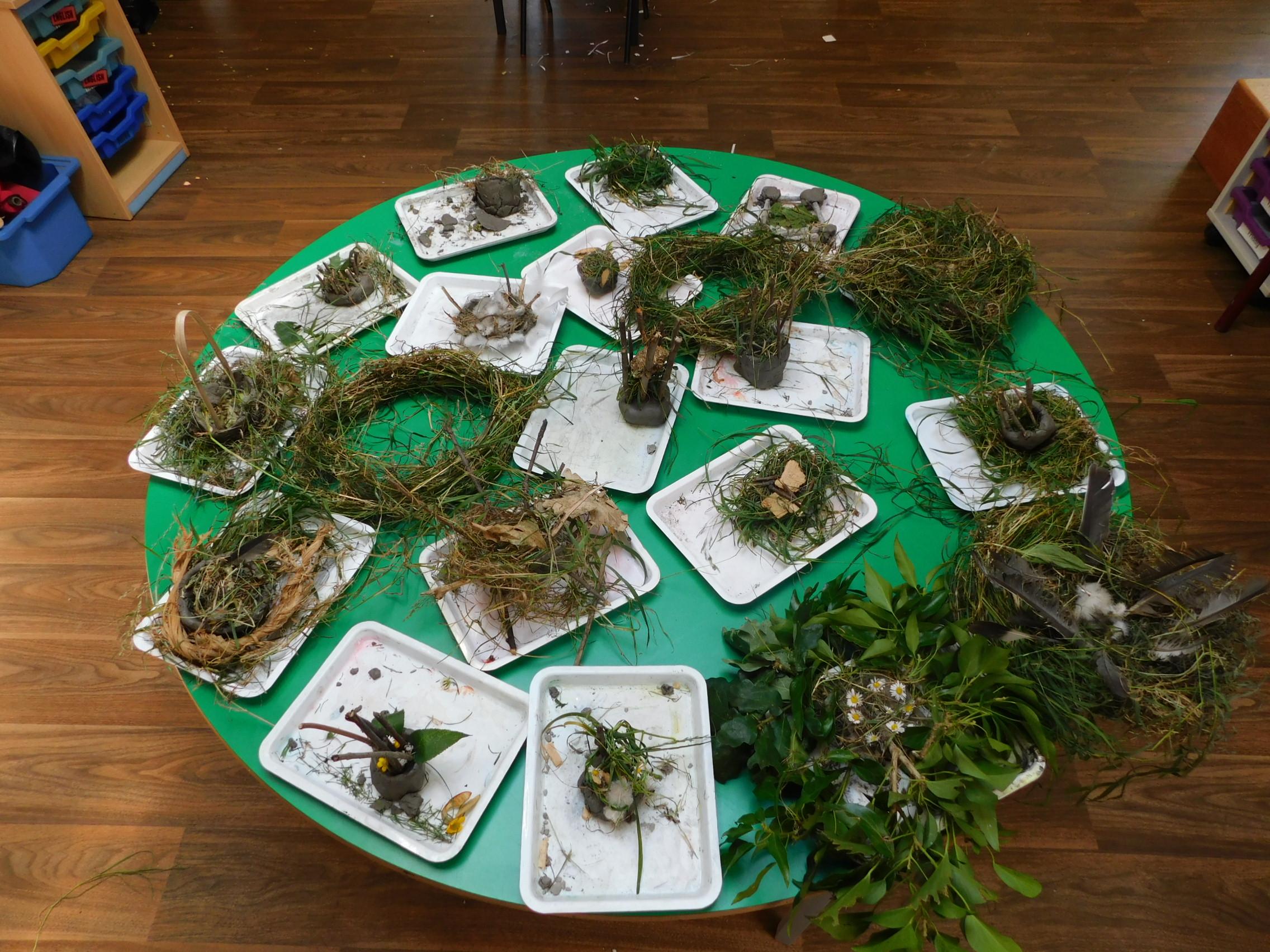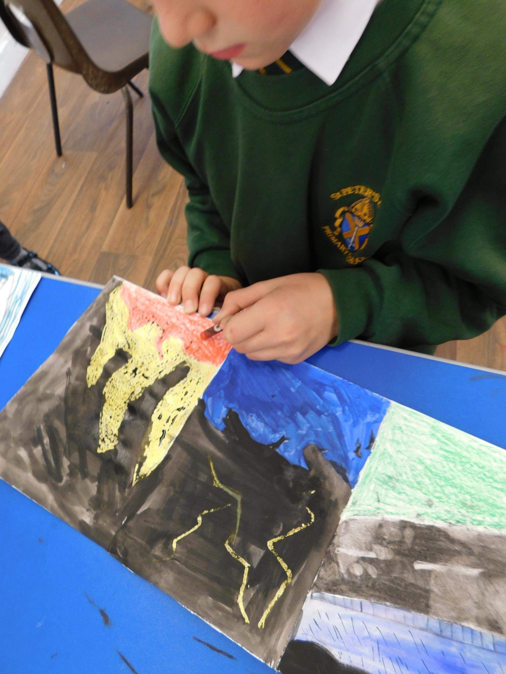 Observational drawing and colourful mark-making from primary and secondary sources, based on our playground trees and British birds.