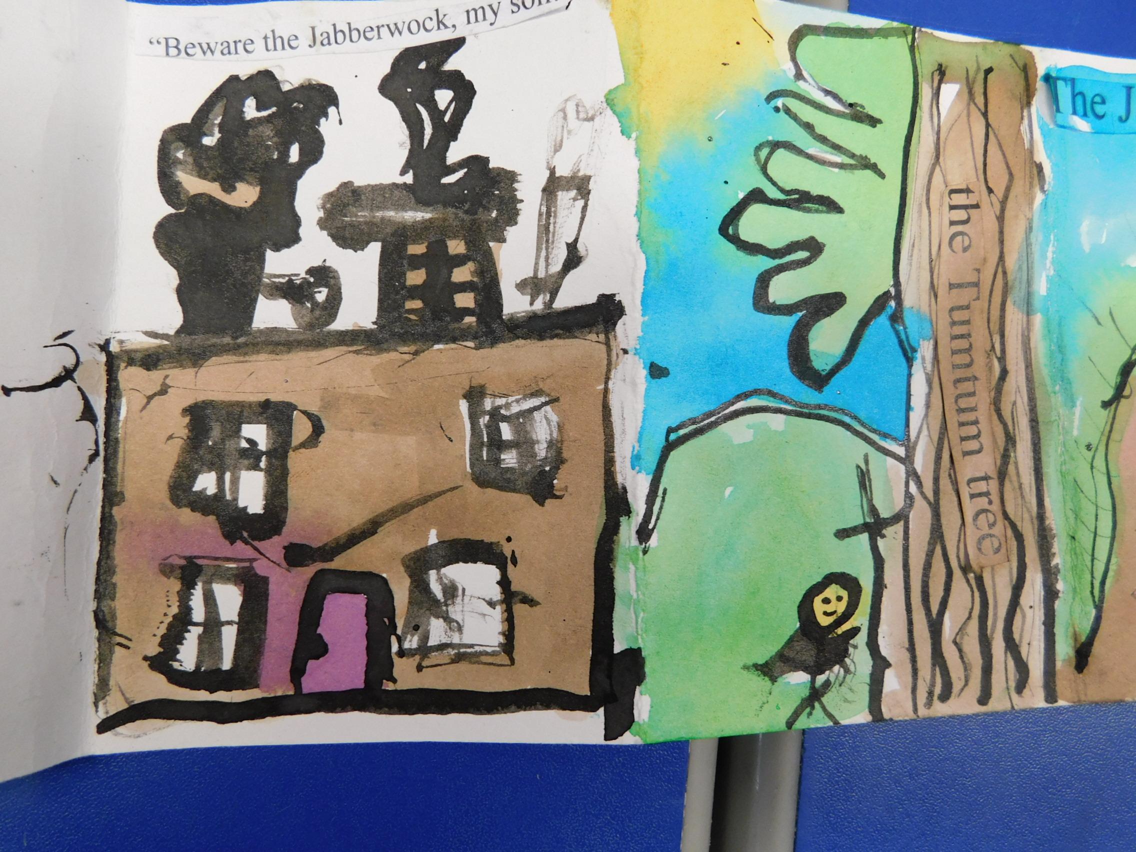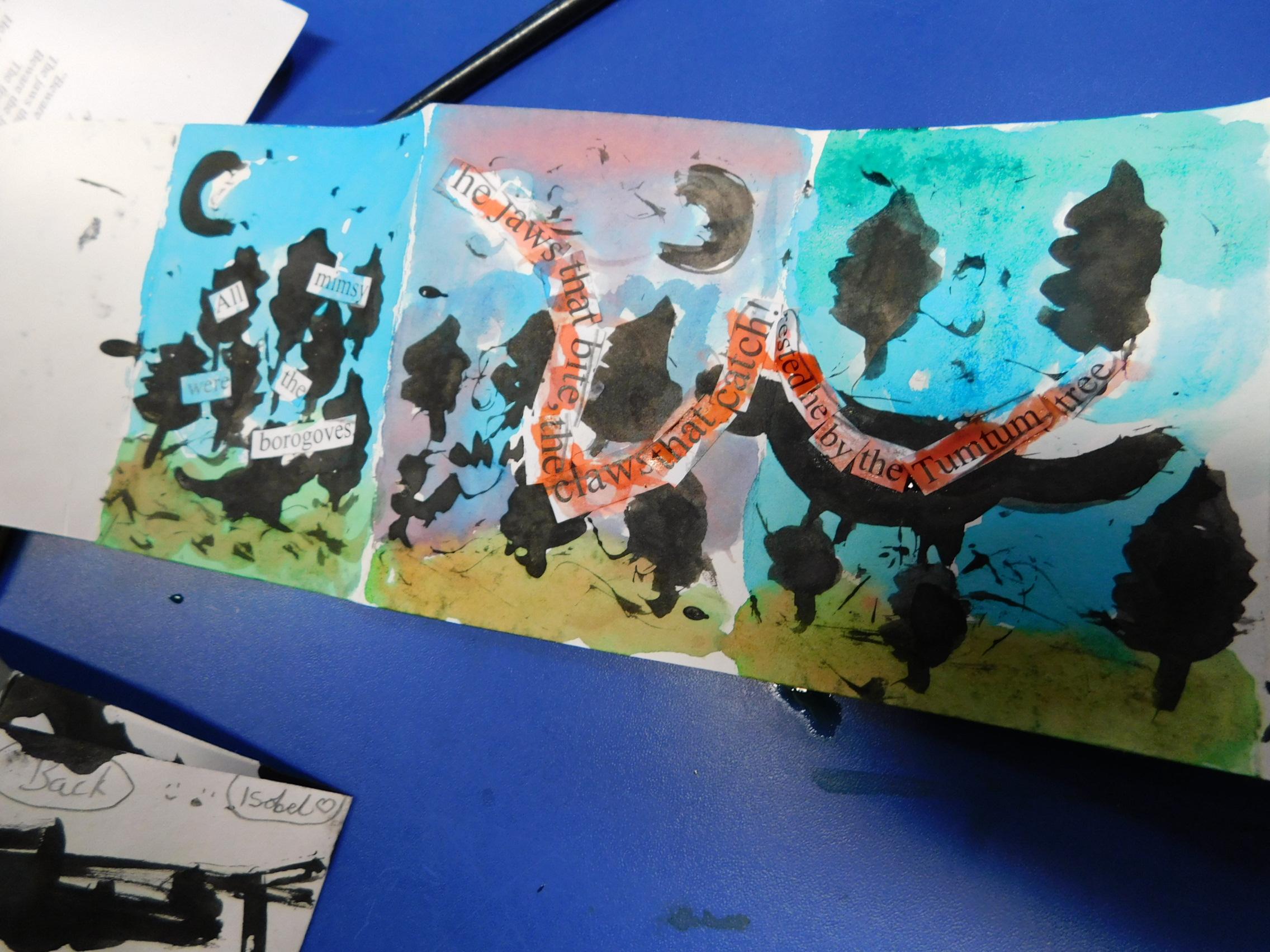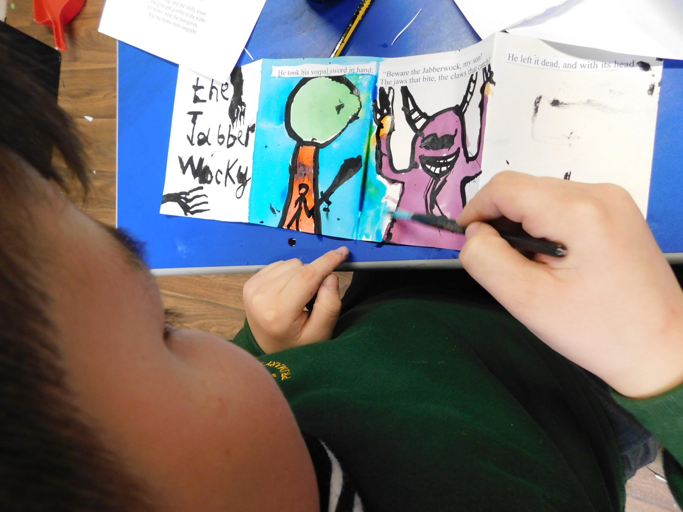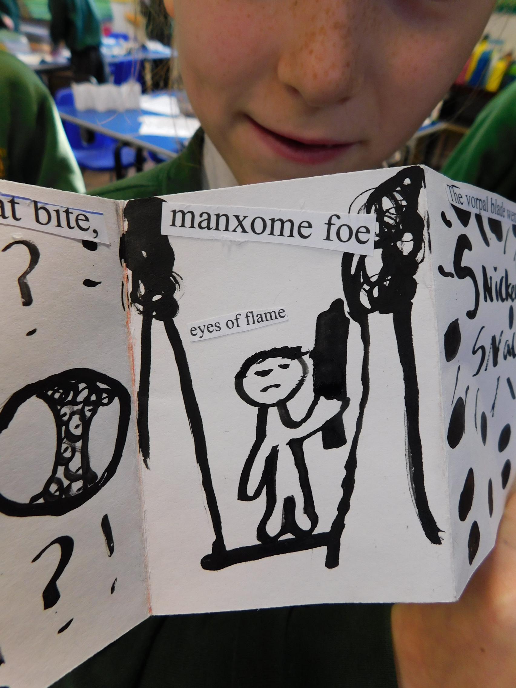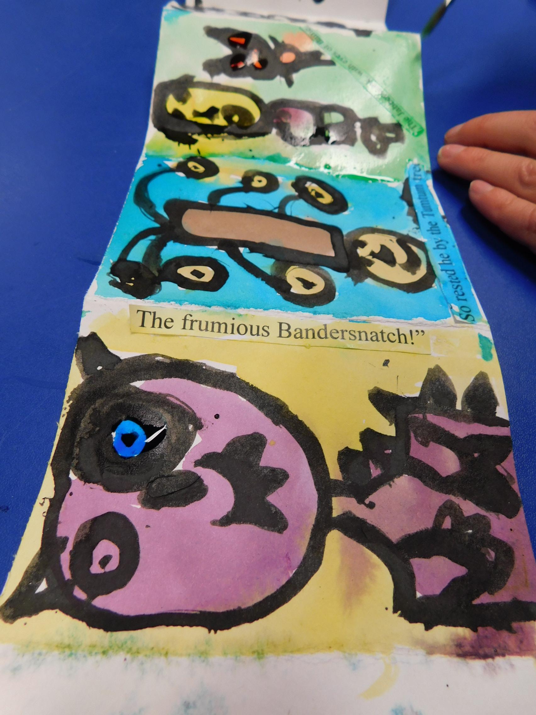 Making concertina books and illustrating the 'Jabberwocky' poem from imagination using quills and ink