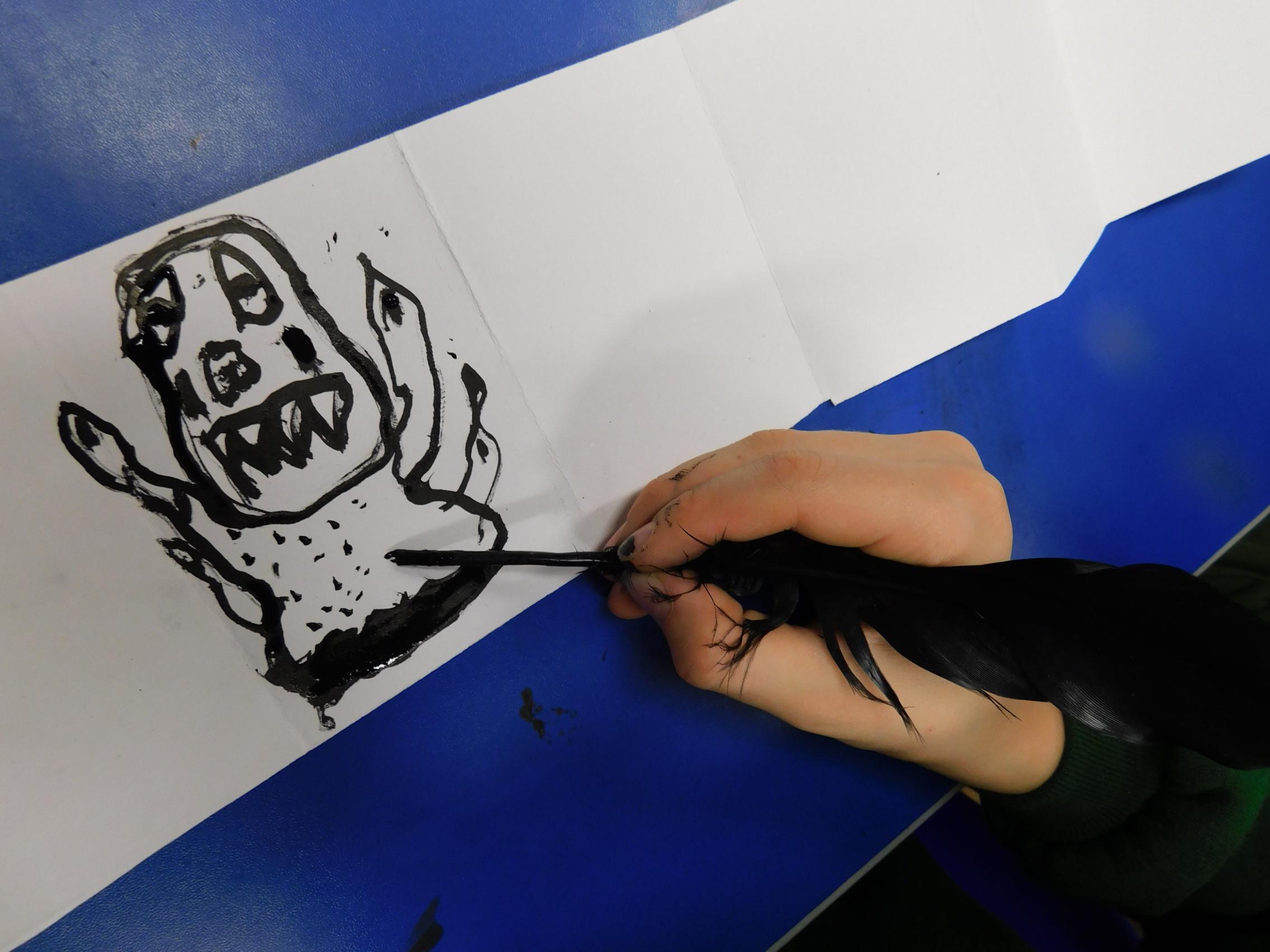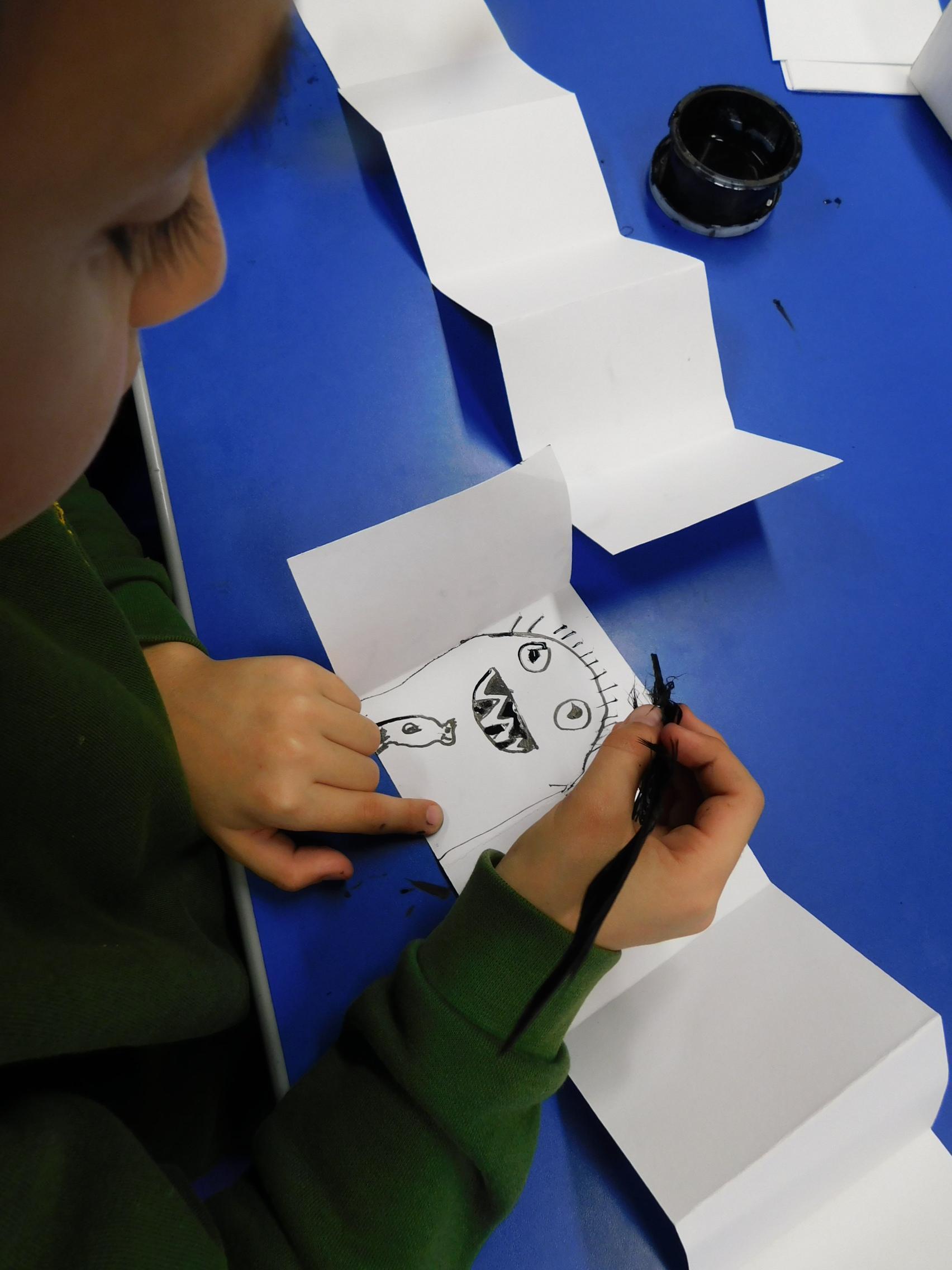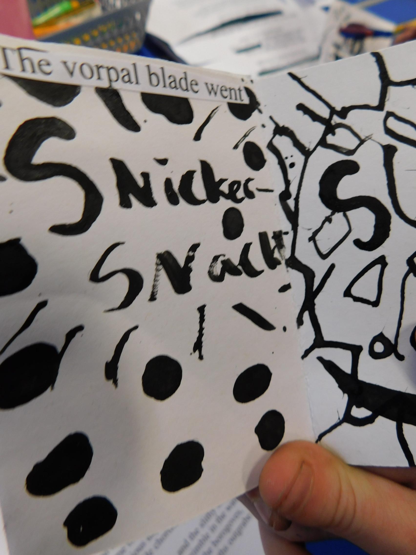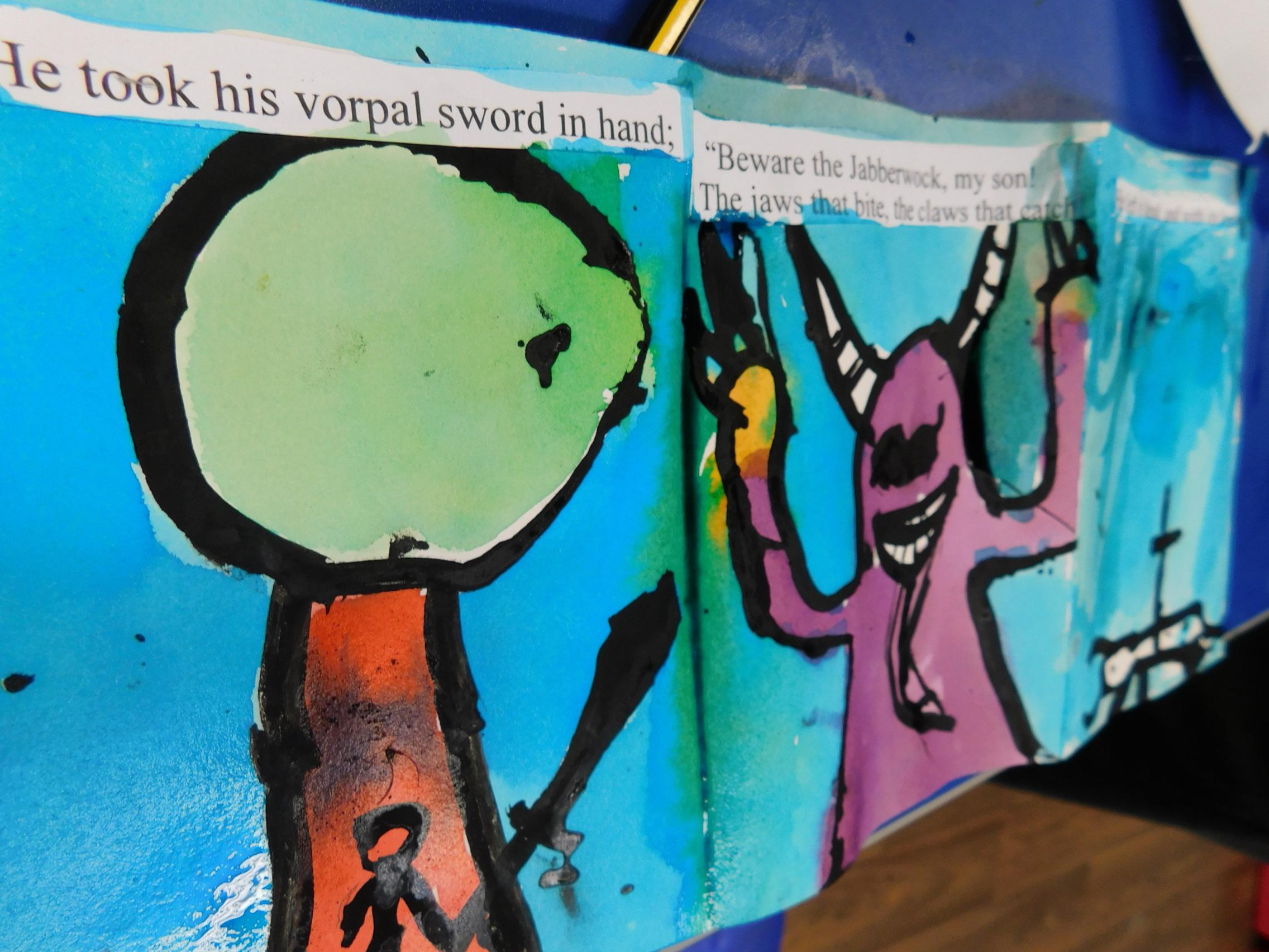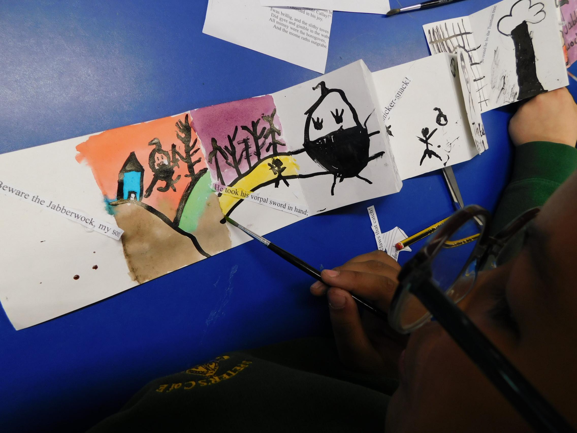 Making concertina books and illustrating the 'Jabberwocky' poem from imagination using quills and ink