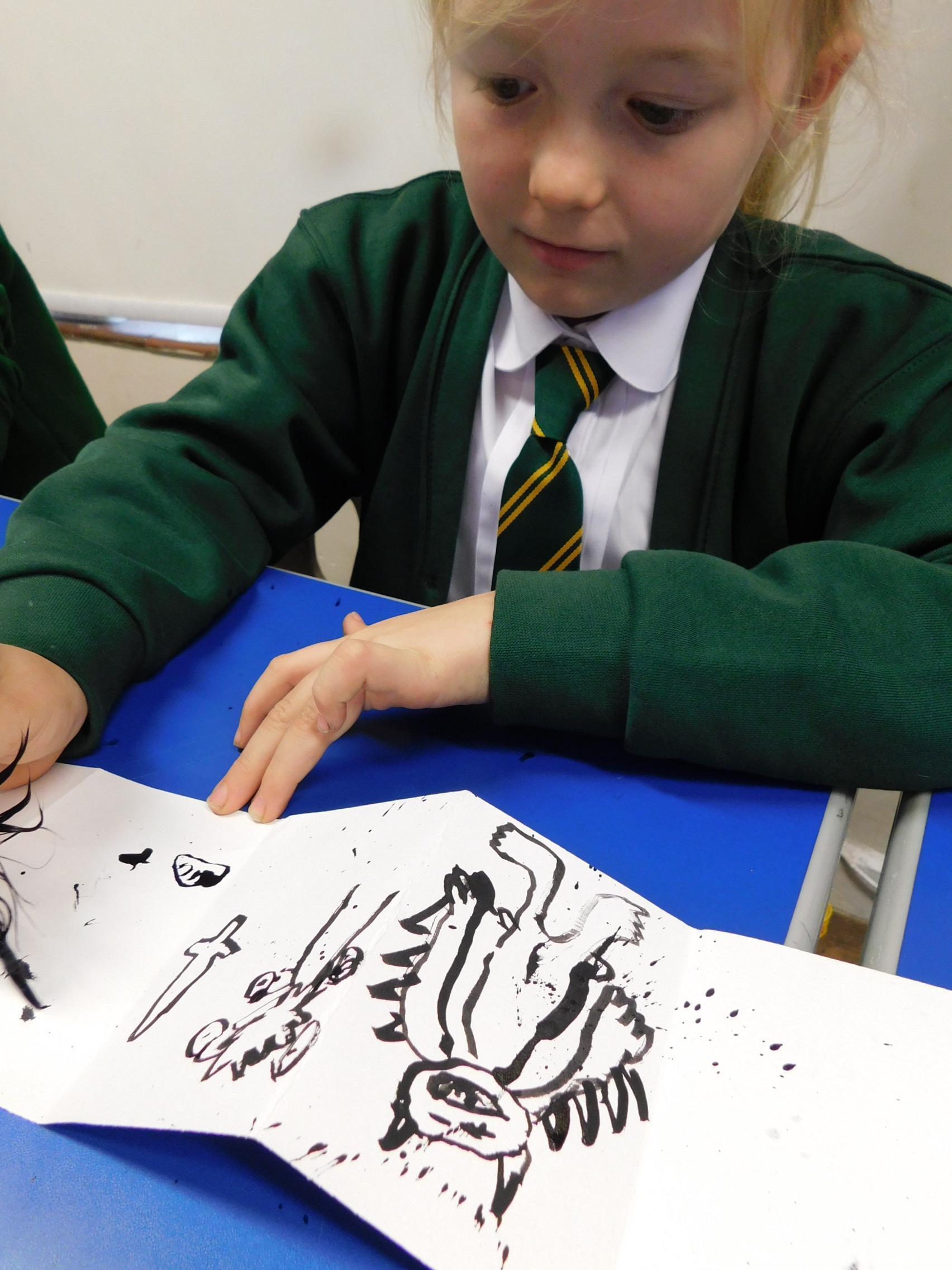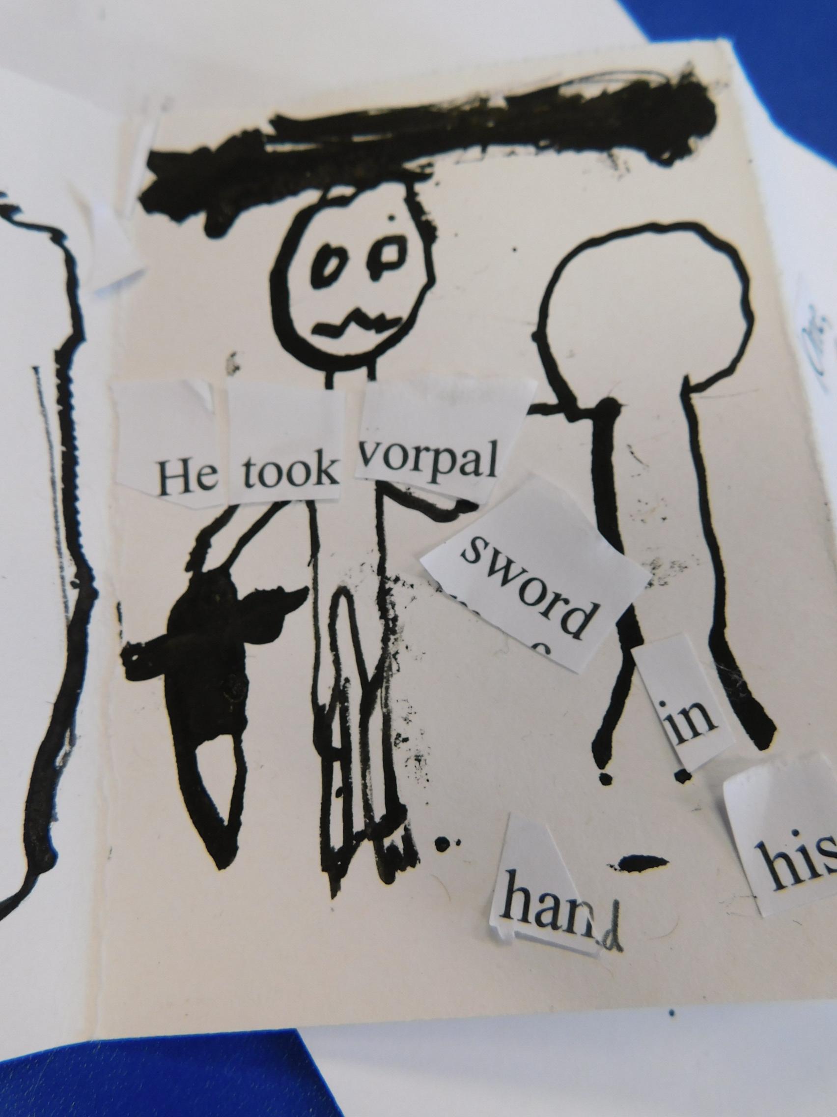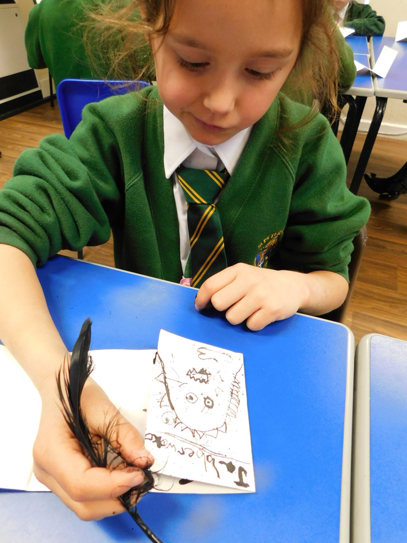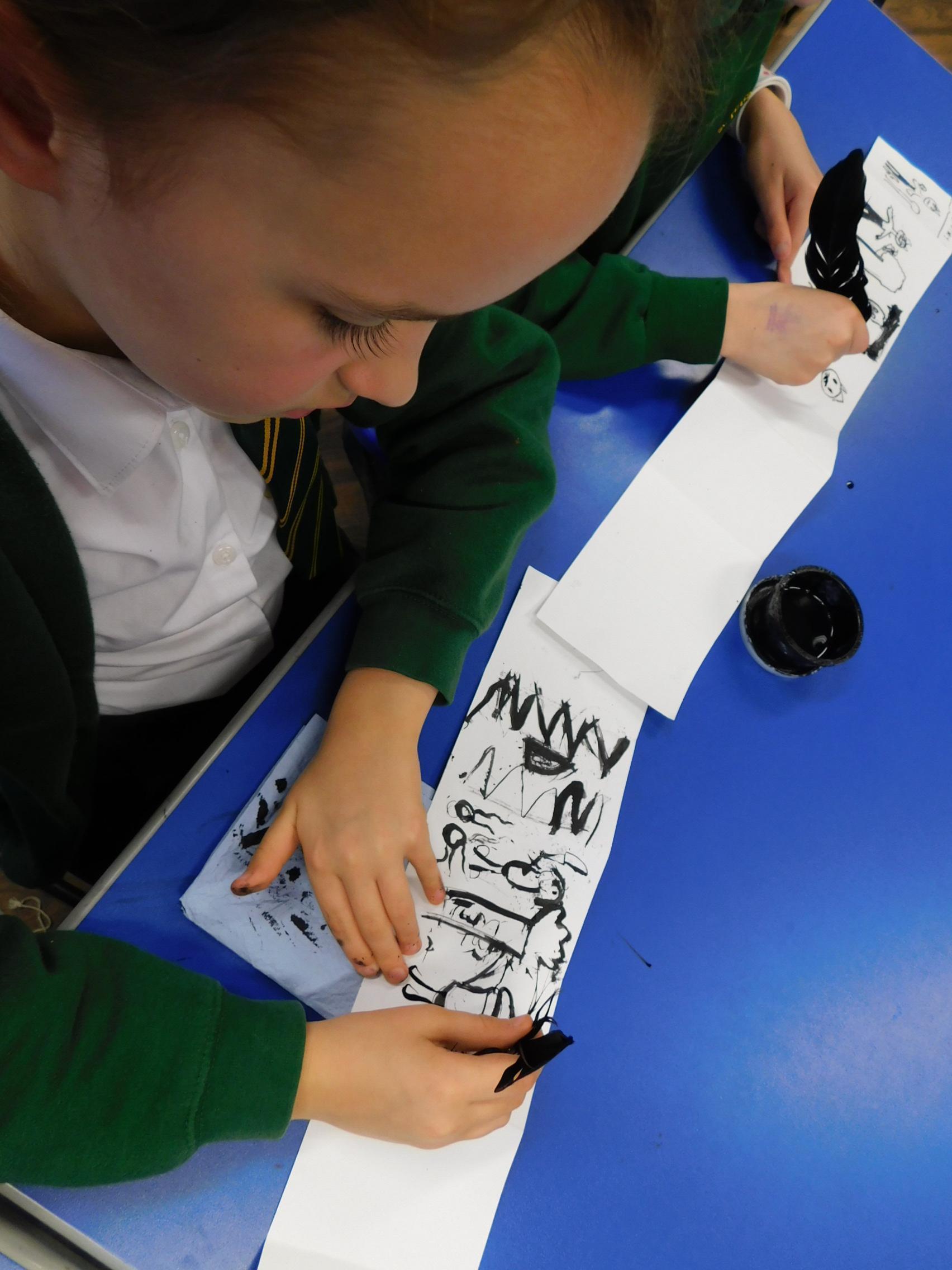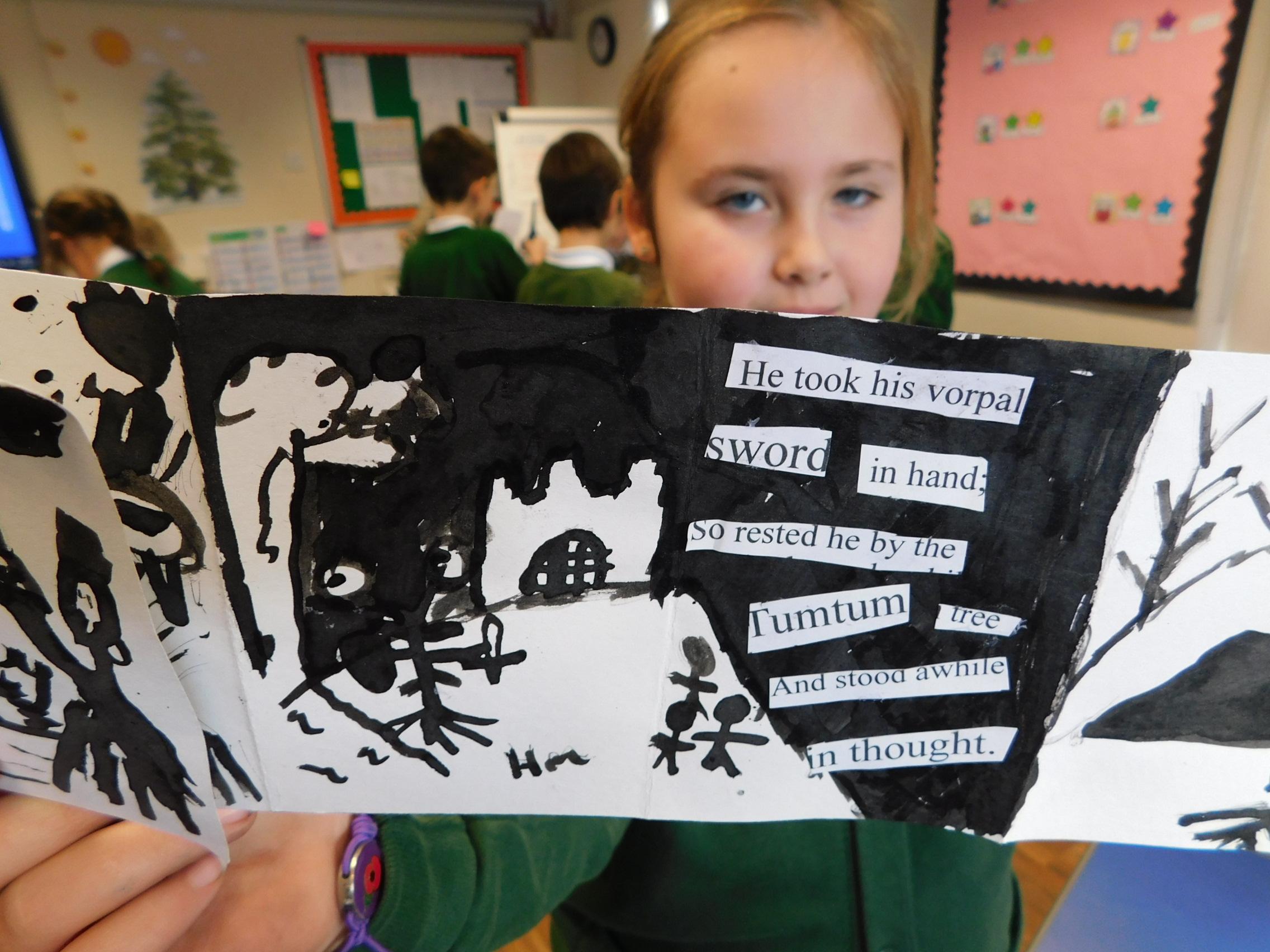 Making concertina books and illustrating the 'Jabberwocky' poem from imagination using quills and ink