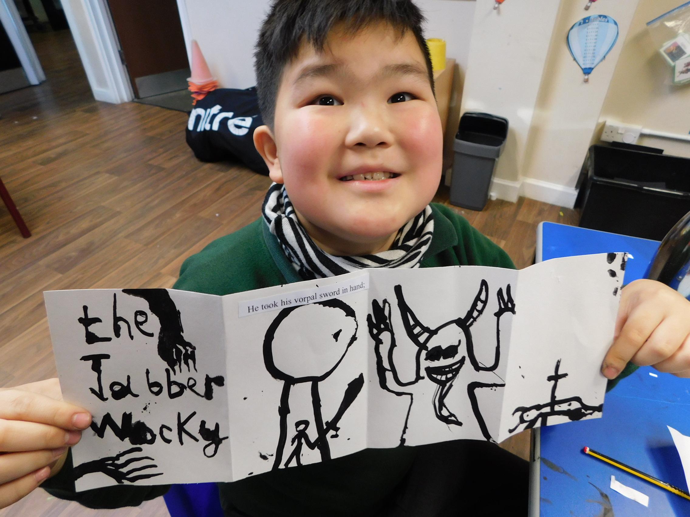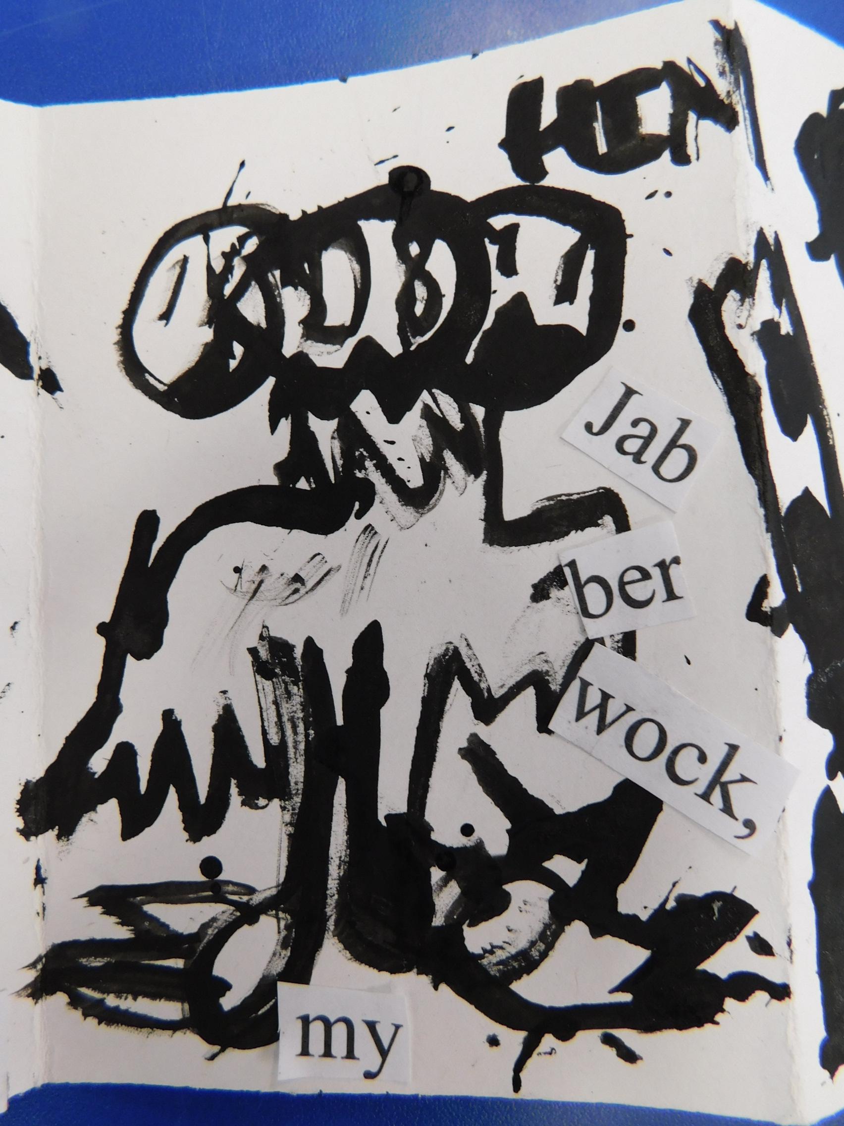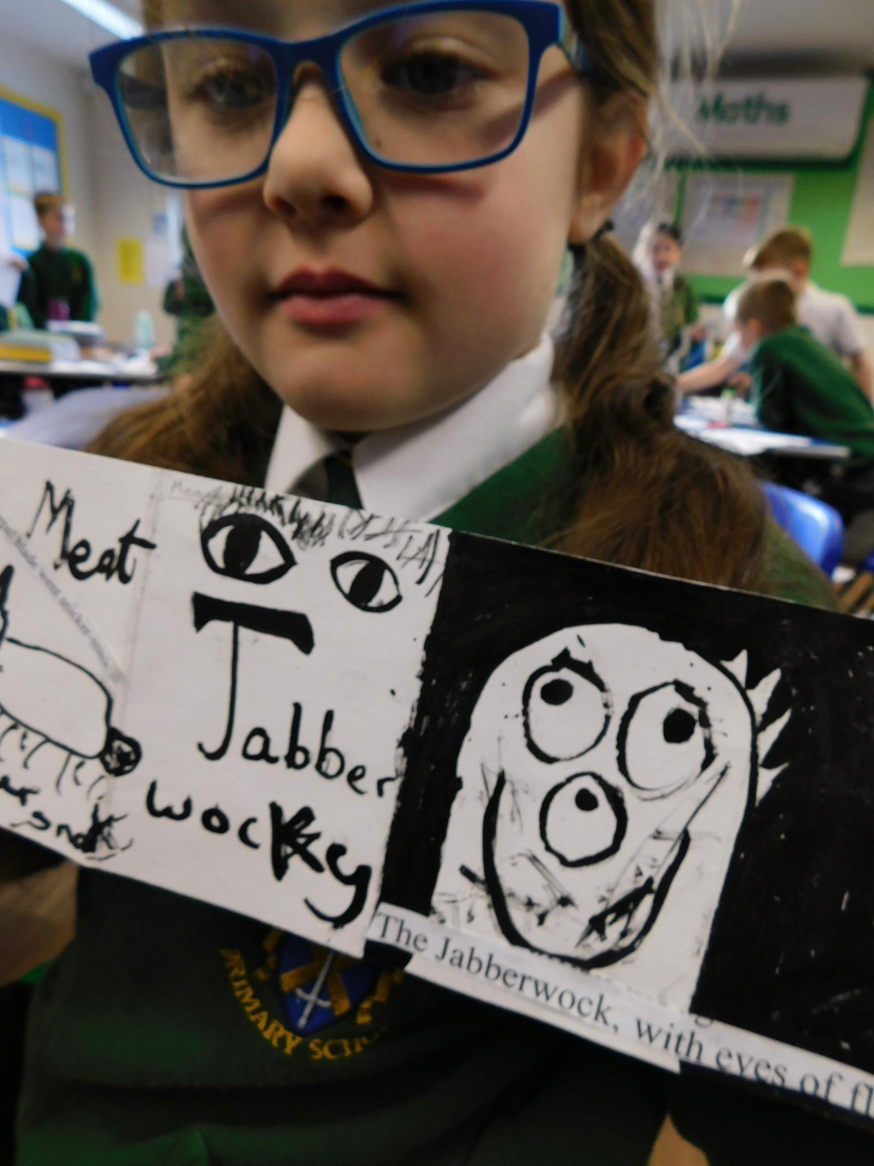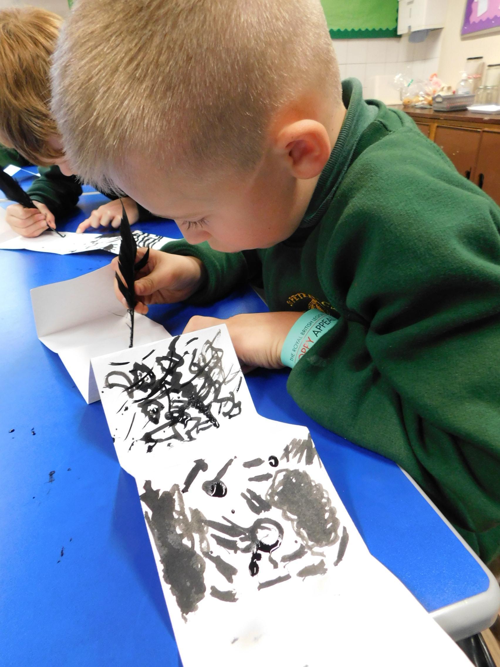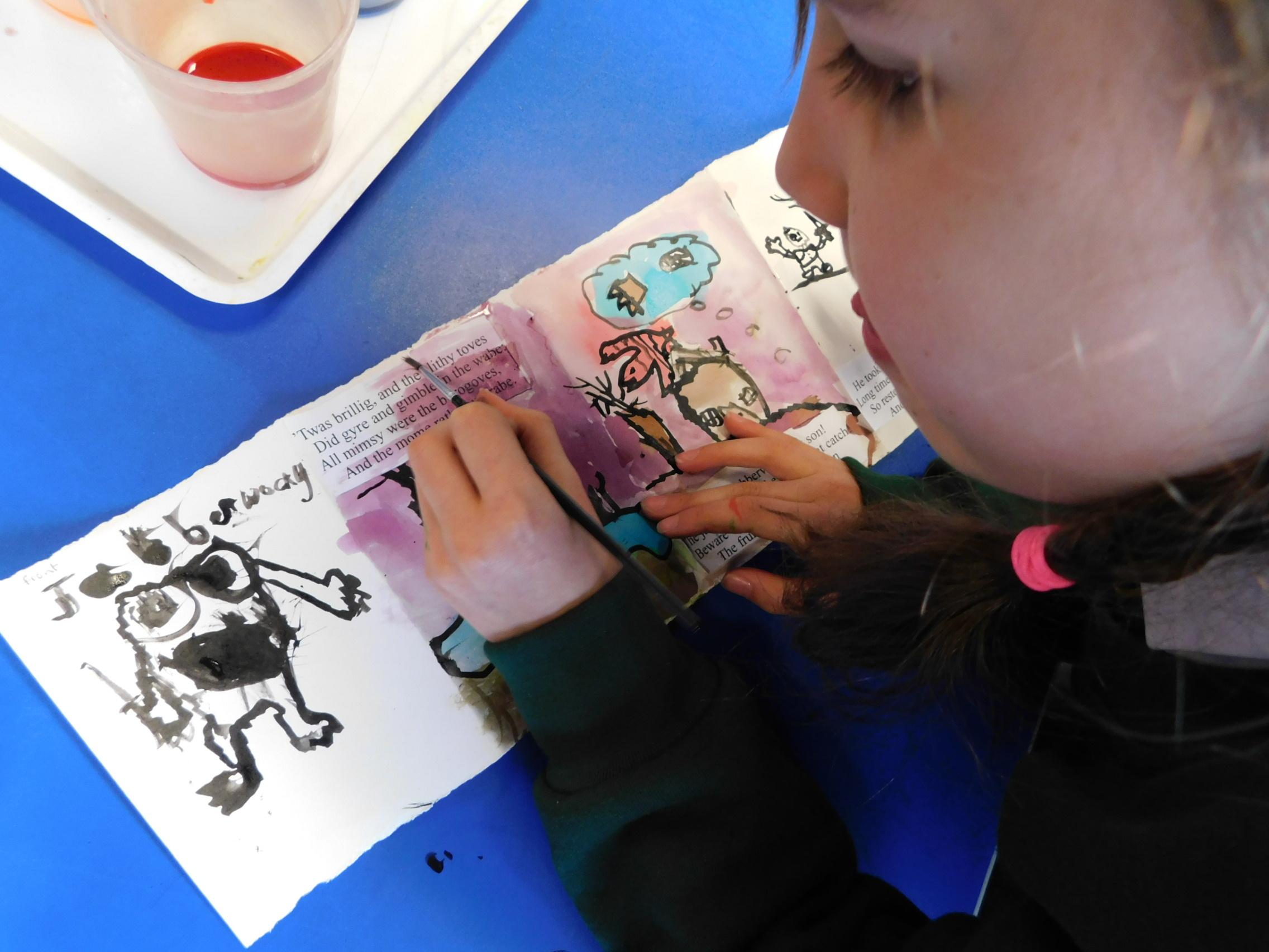 Making concertina books and illustrating the 'Jabberwocky' poem from imagination using quills and ink