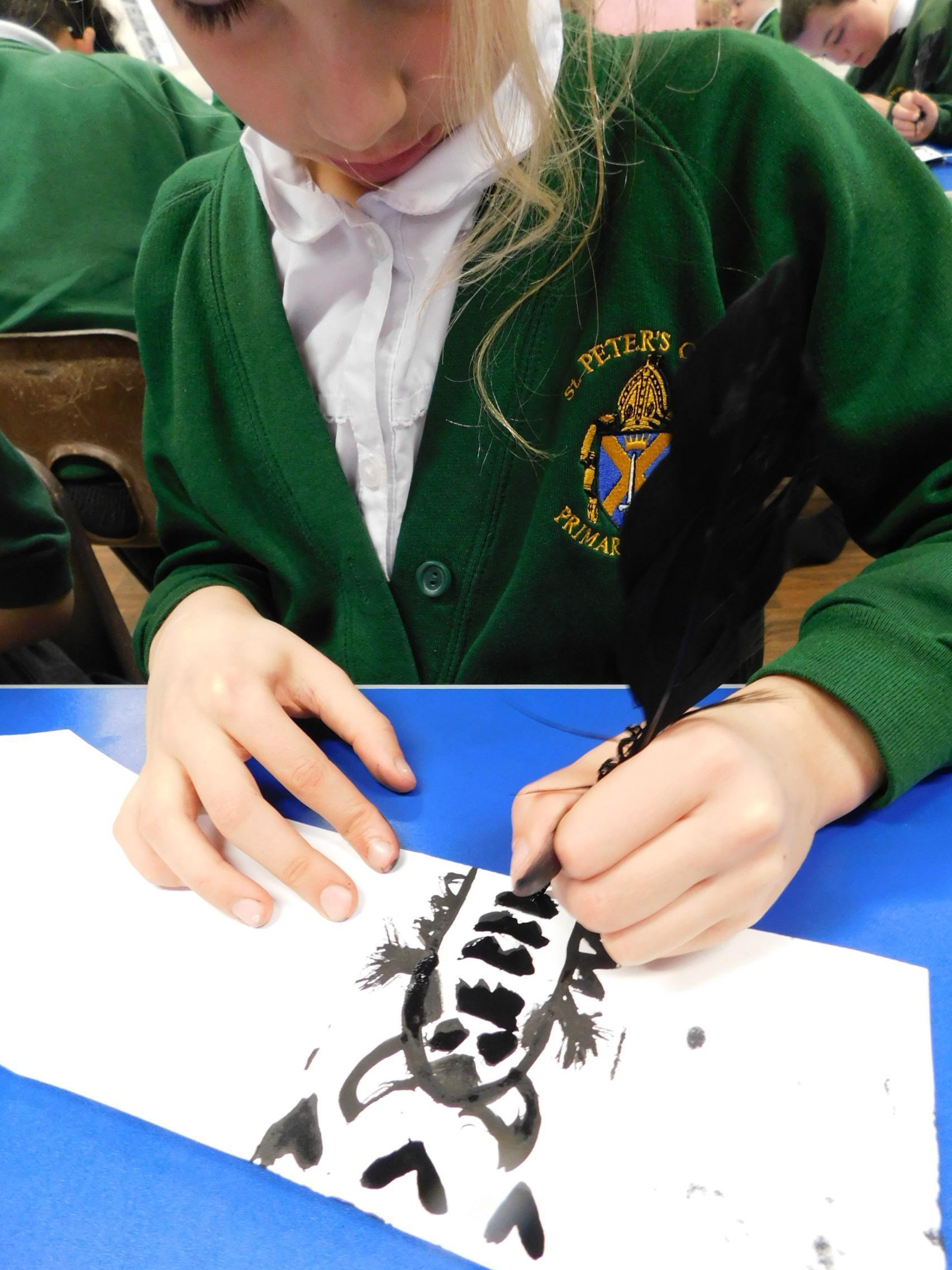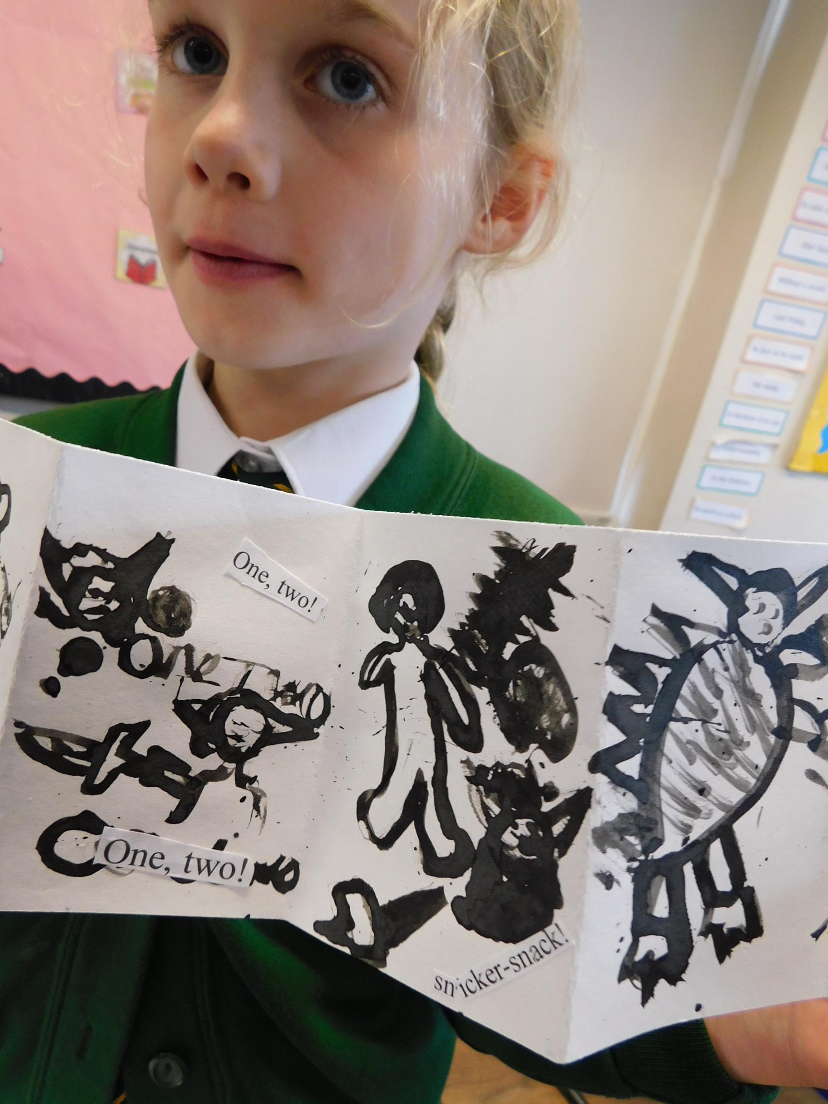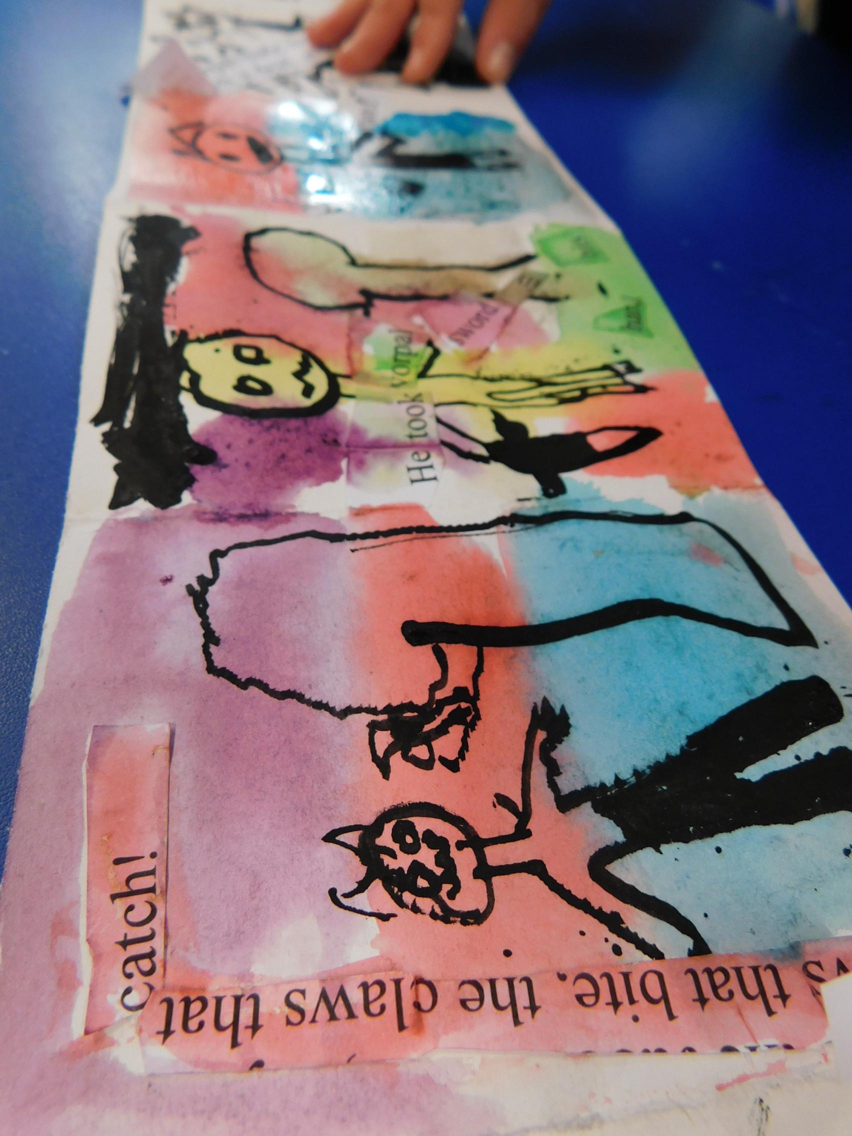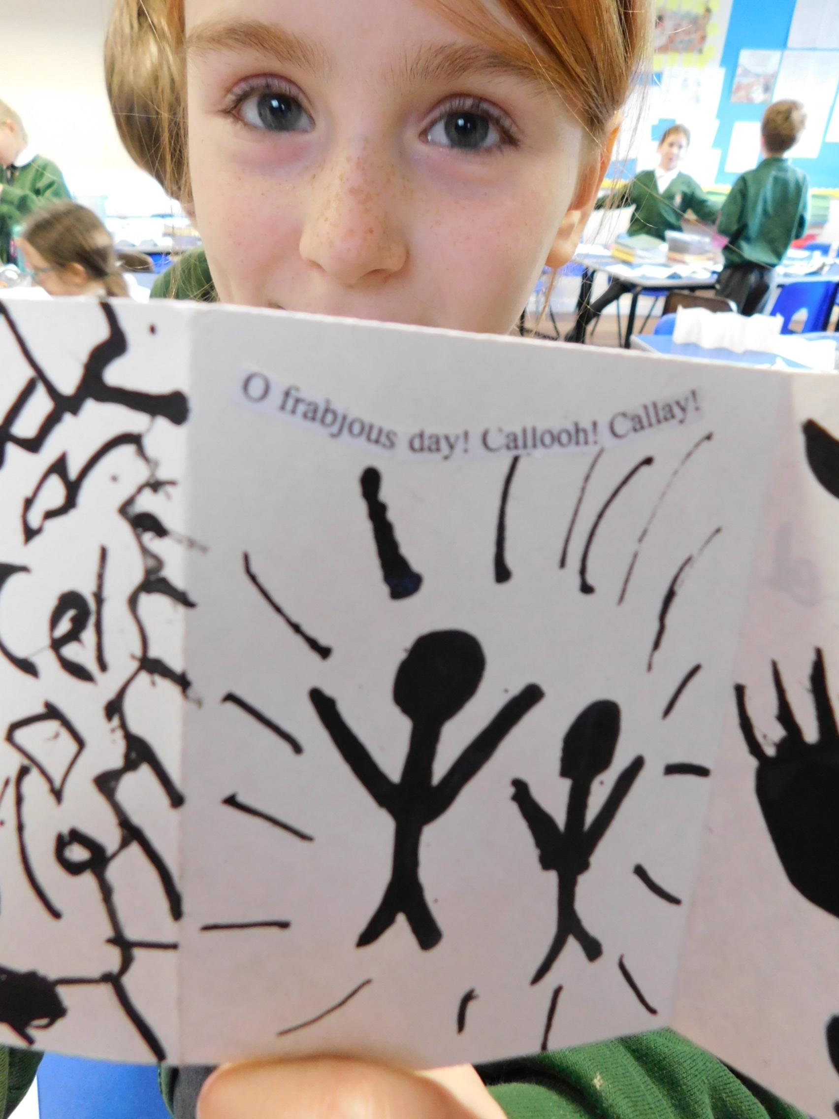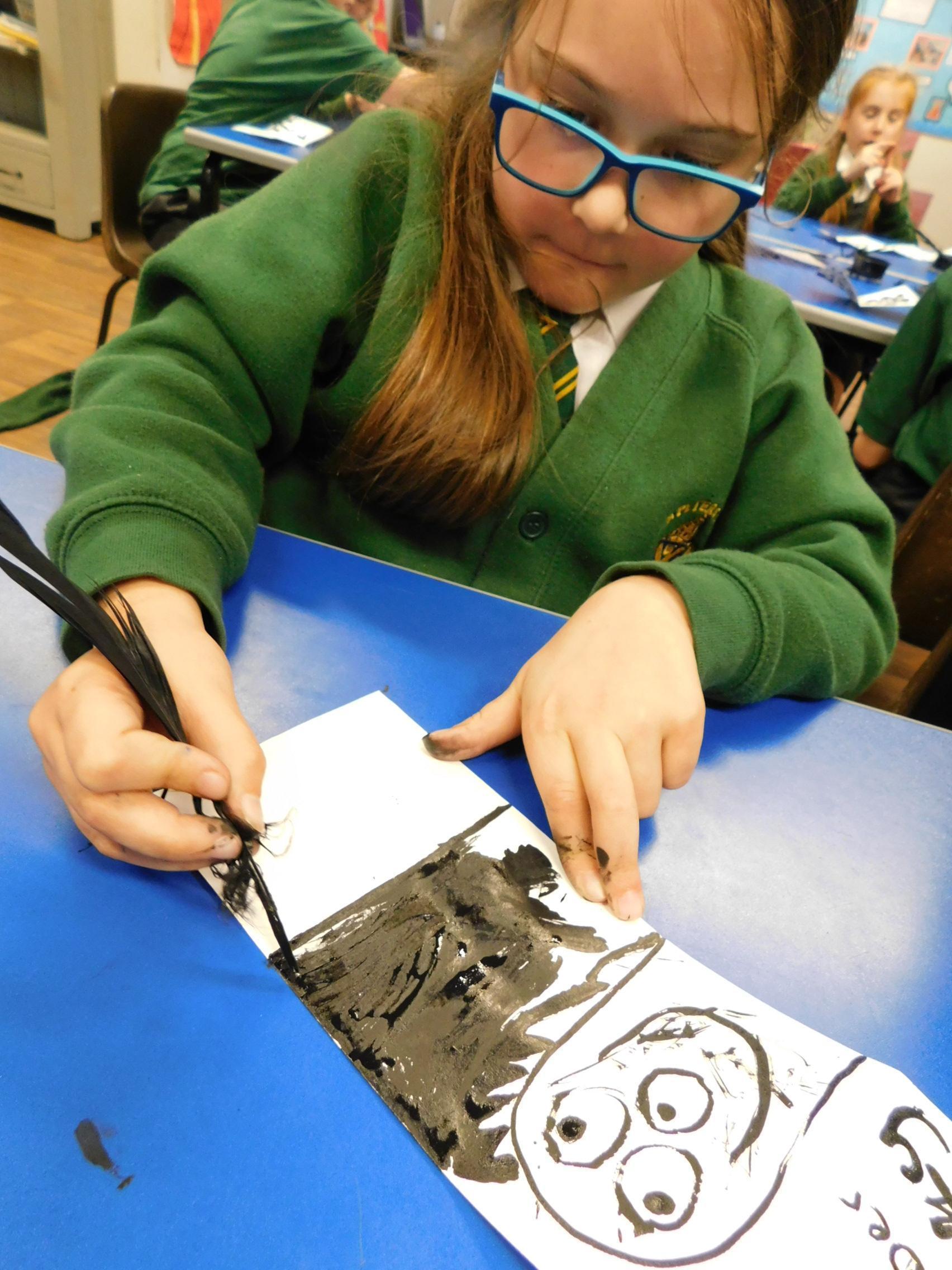 Making concertina books and illustrating the 'Jabberwocky' poem from imagination using quills and ink